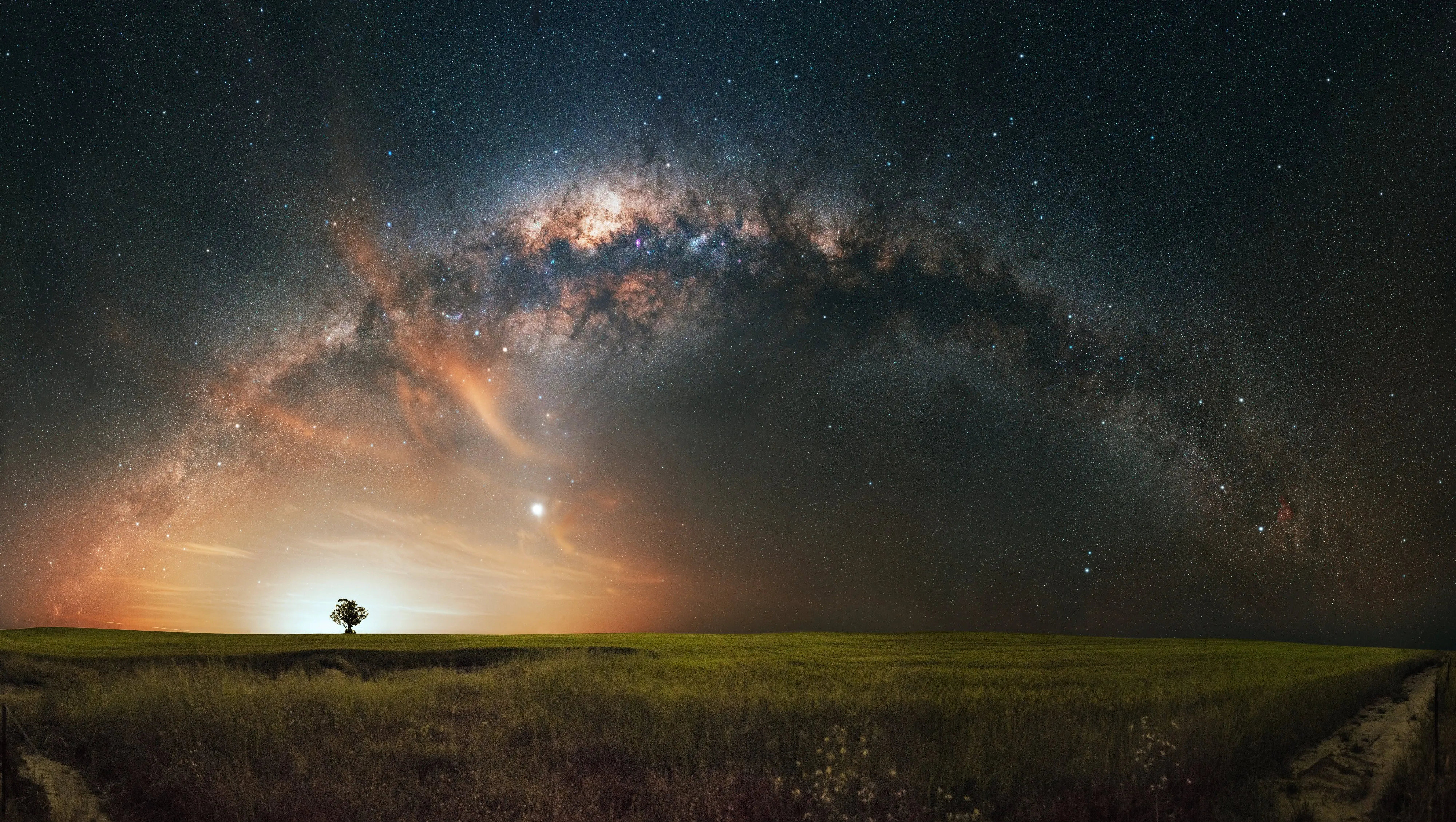Nature, Scenery, Sky, Trees, Grass, Field, Night, Stars, Galaxy, Space 4K Wallpaper