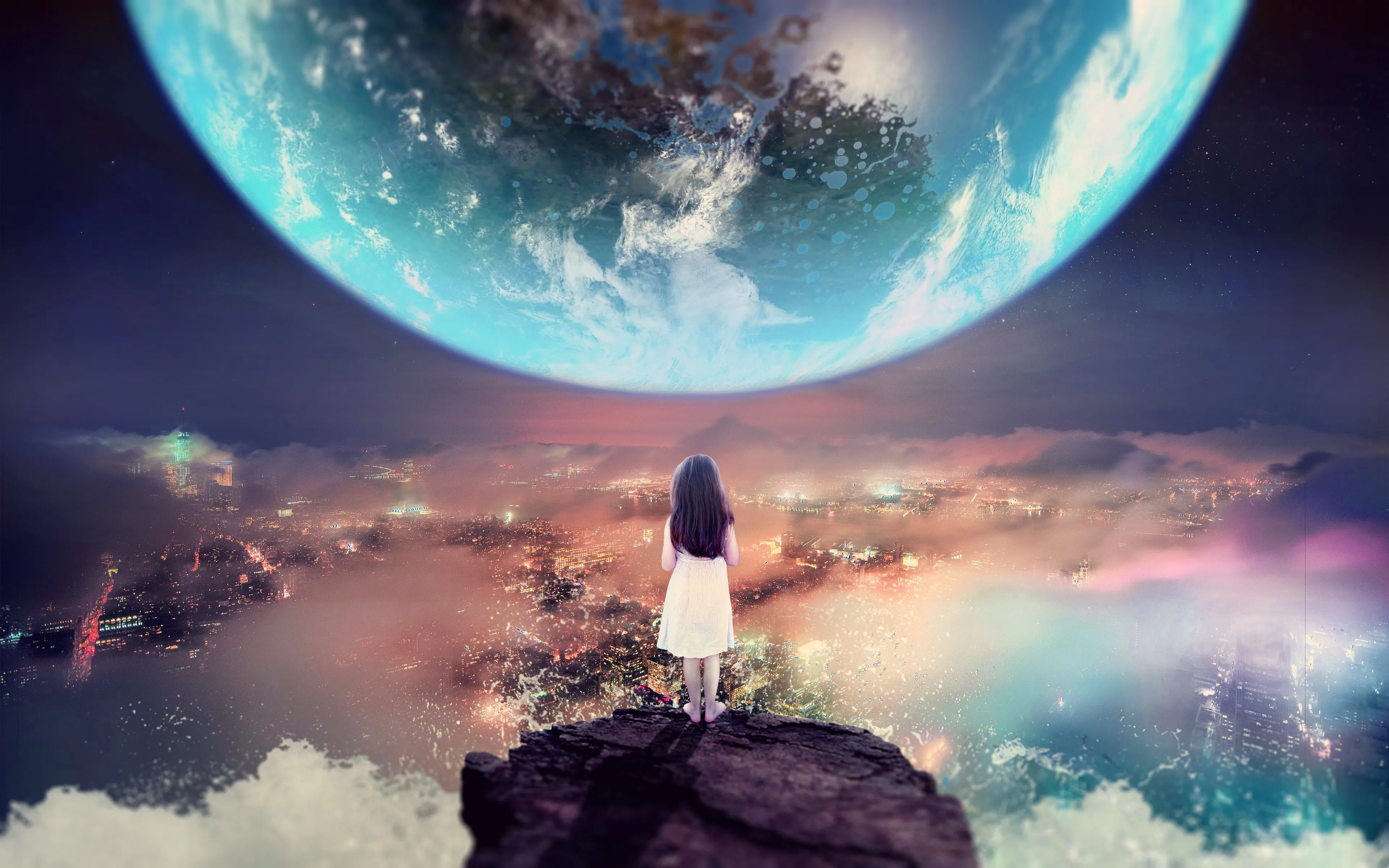 Earth, World, Mist, Cloud, Nature, AI Art, Cliff, Ocean, City, Night, Planet, Universe, Computer Wallpaper, 4K Wallpaper