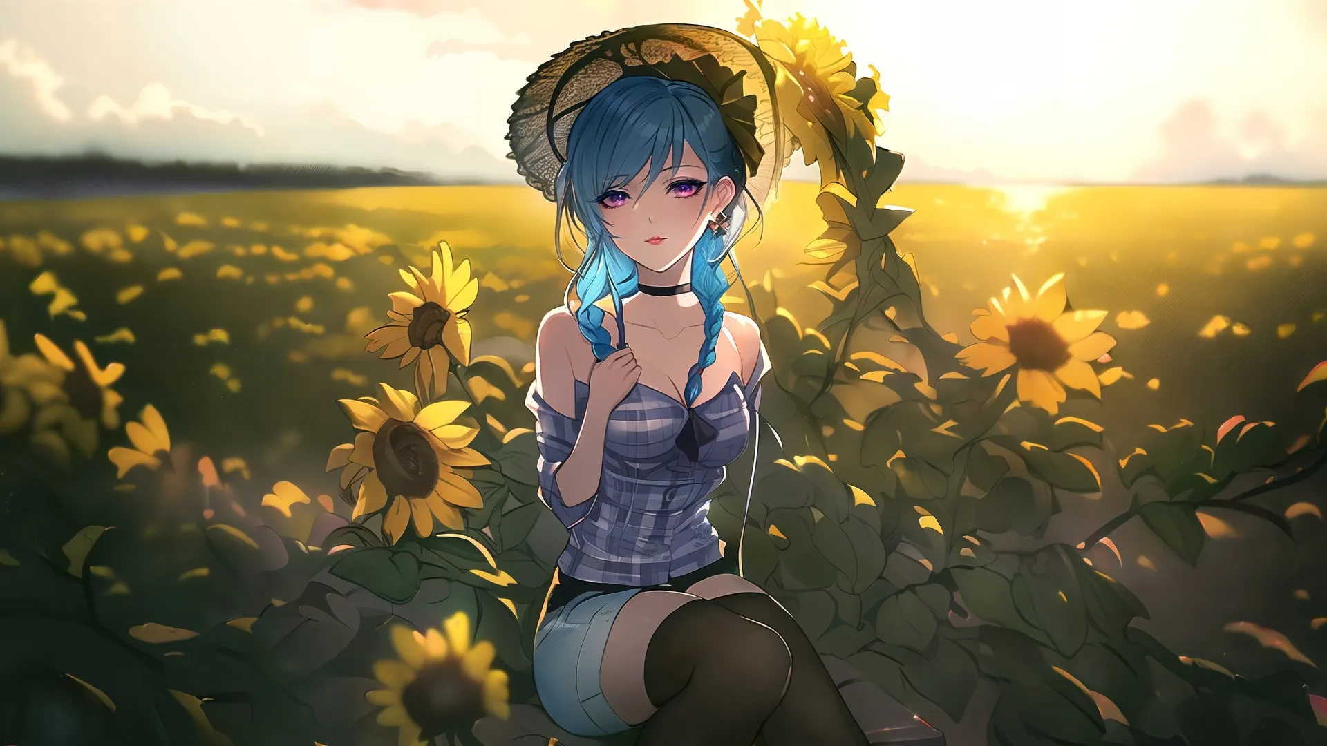 Blue hair, Braid, Anime girl, Anime, AI art, Mia, AI art, Flowers, Sunflowers, Purple eyes, Necklace, Socks