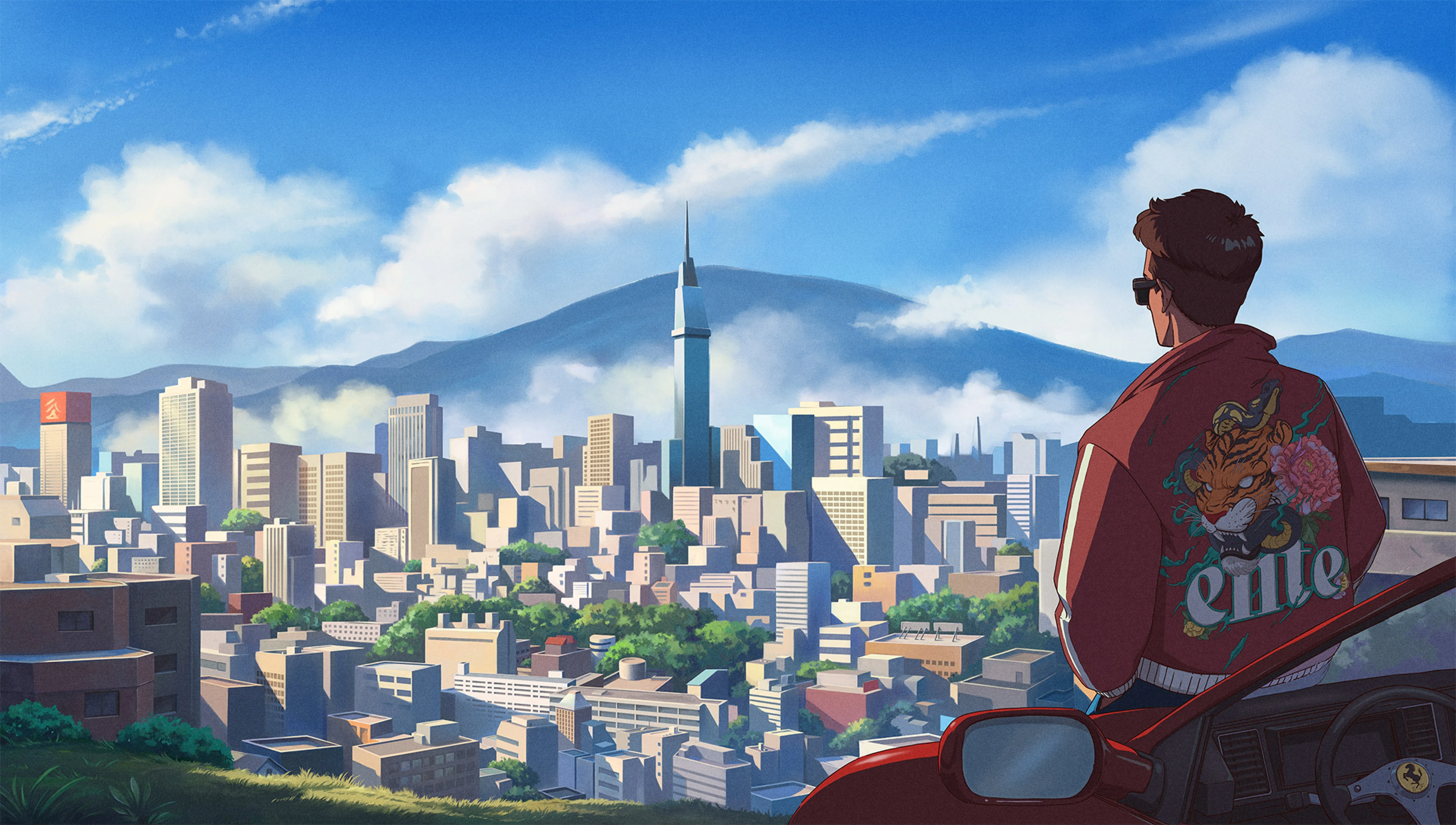 Digital Art, Illustration, Digital, Painting, City, Landscape, Architecture, Skyscraper, Man, Vehicle, Car, Ferrari, Cloud, Mountain, Sky, 4K Wallpaper