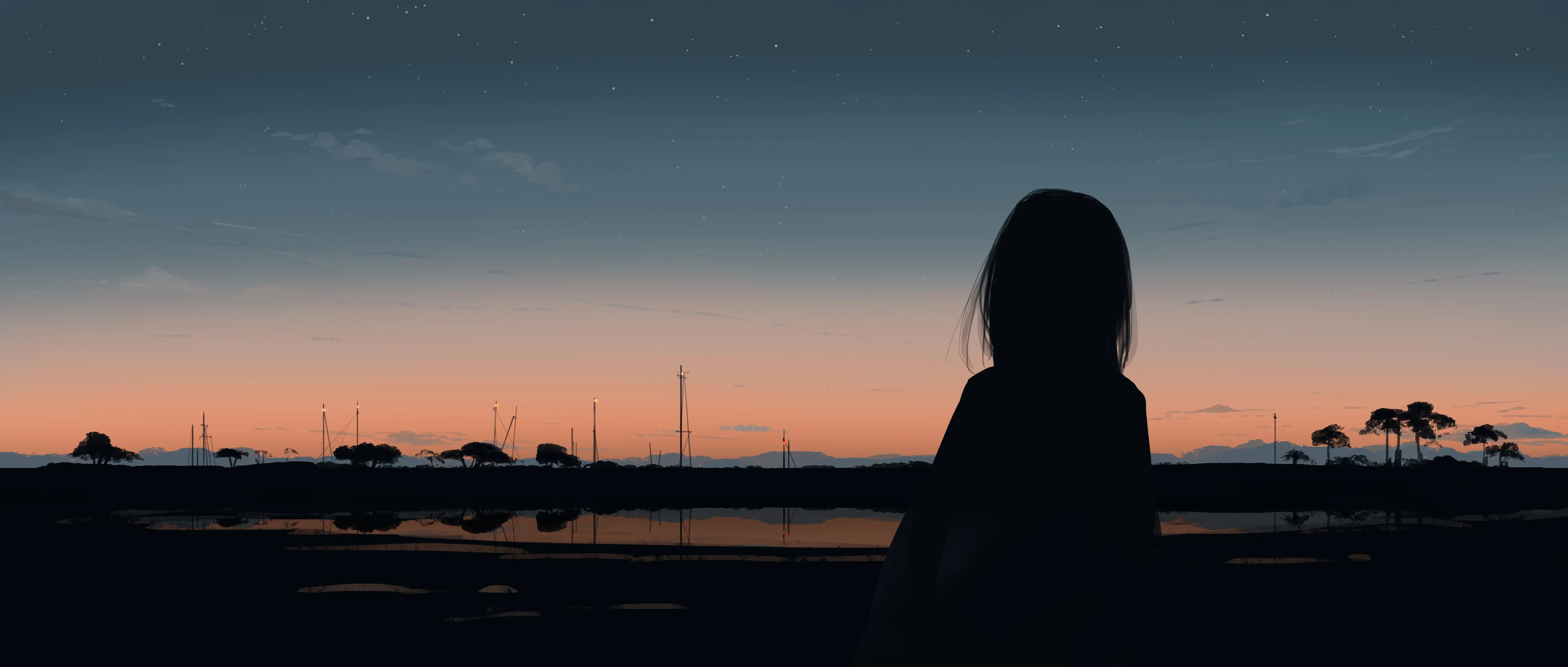 Elegant Illustration Sunset Stars Ultra-Wide Landscape Silhouette 4K Wallpaper