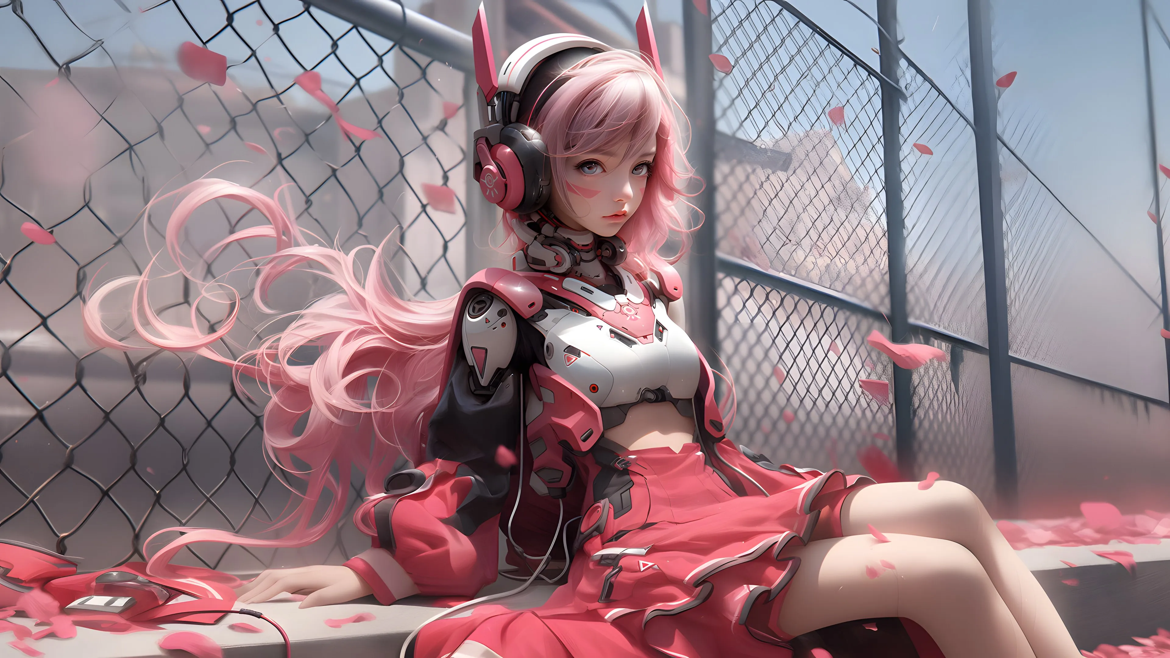 Woman, Long Hair, Art, AI Art, Petals, Fence, Headphones, Computer Wallpaper, 4K Wallpaper