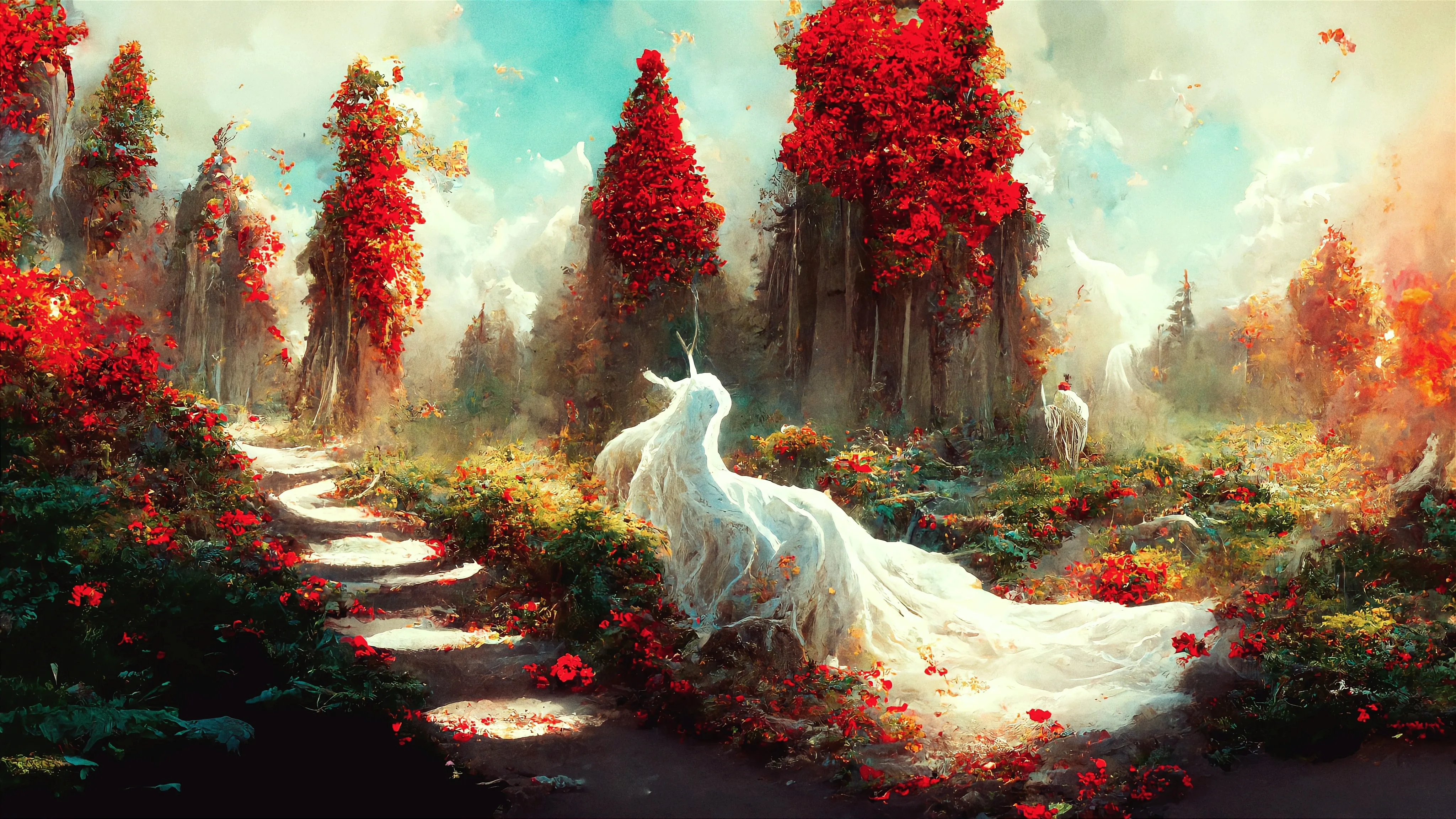 Tree, Unicorns, Trees, Scenery, Red Background, Red Flowers, Flowers, Plants, AI Art, Art, 4K Wallpaper