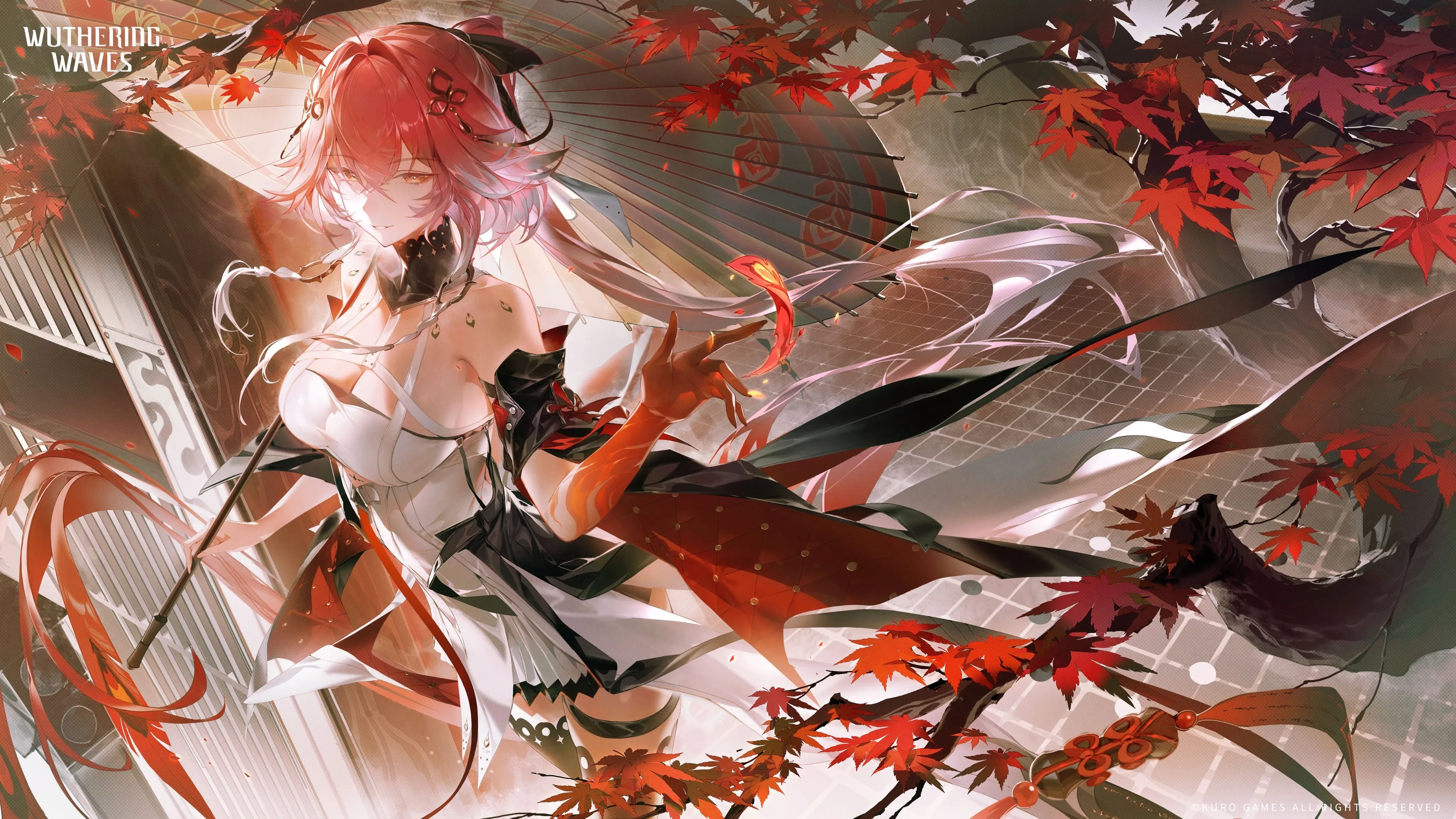 Electronic Game Character Smiling Standing Long Hair Howling Wave Changli Umbrella Skirt Headband High Heels Maple Leaves Leaves Anime Girl 4K Wallpaper