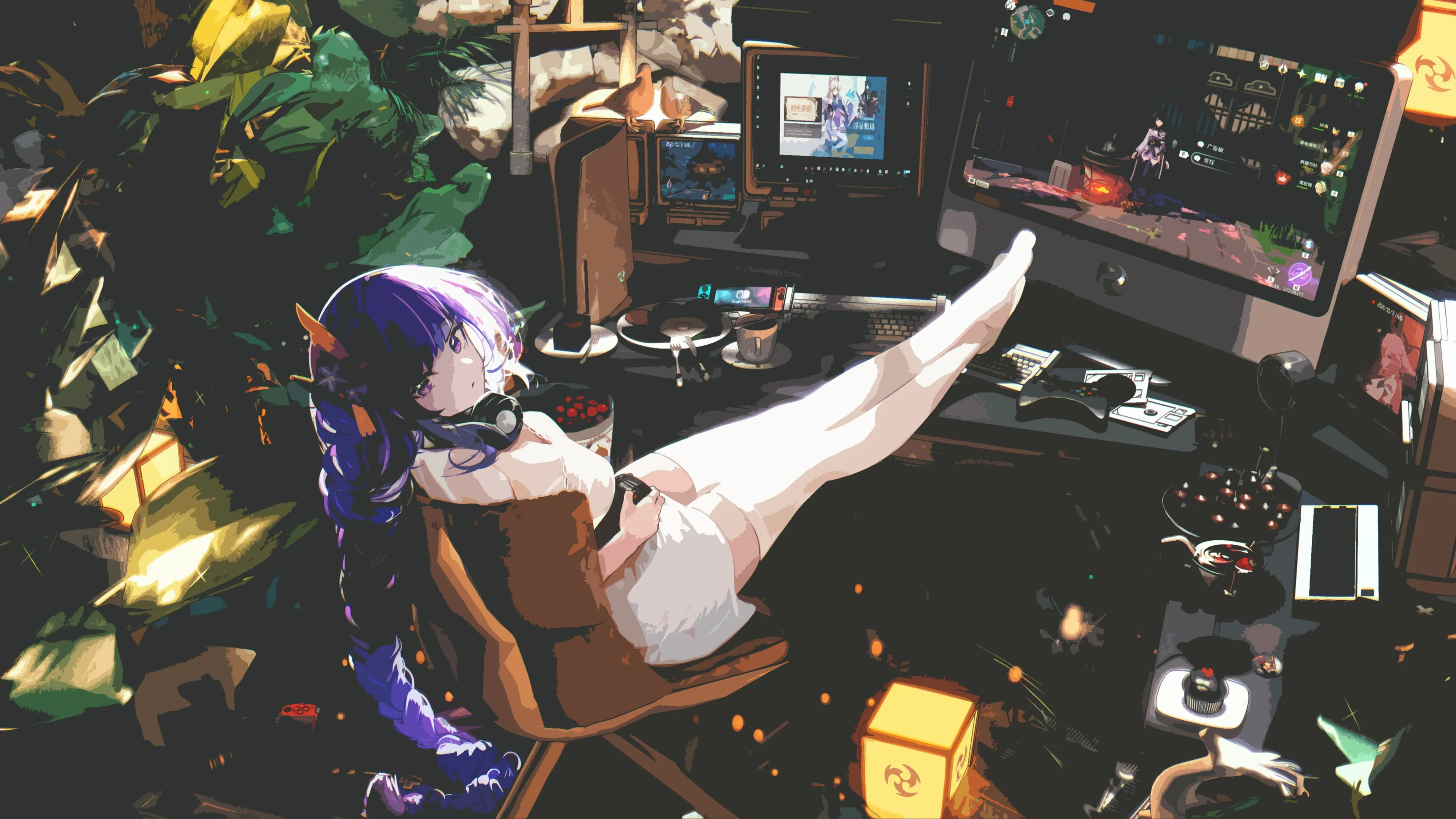 Female, blue hair, ponytail, game player, purple hair, sitting, painting, anime, girl, white dress, illustration, white stockings, game room, 4K wallpaper