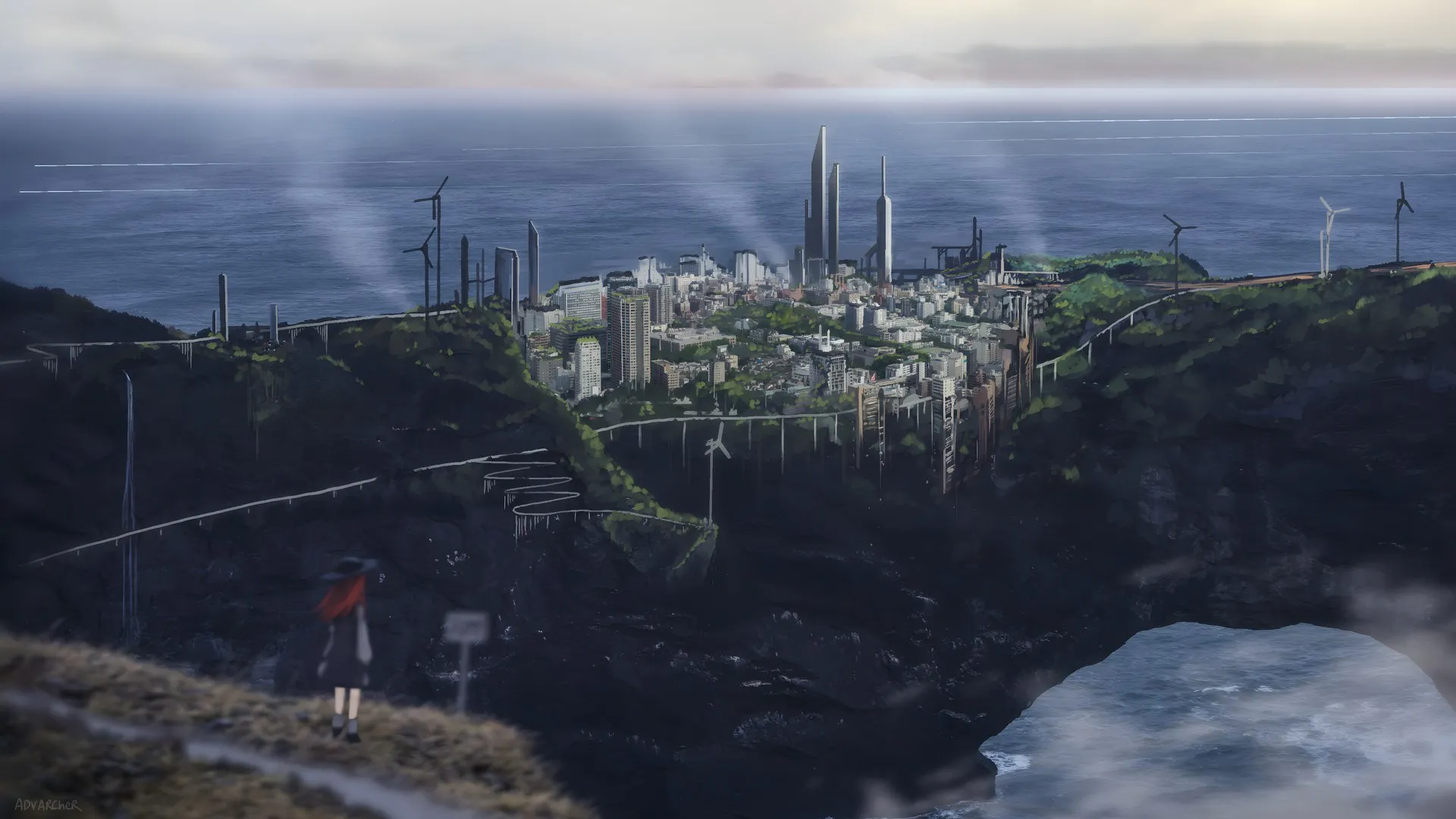 Digital Art, Artworks, Sea, Skyscrapers, Wind Turbines, Cliffs, Urban Landscape, Computer Wallpaper, 4K Wallpaper