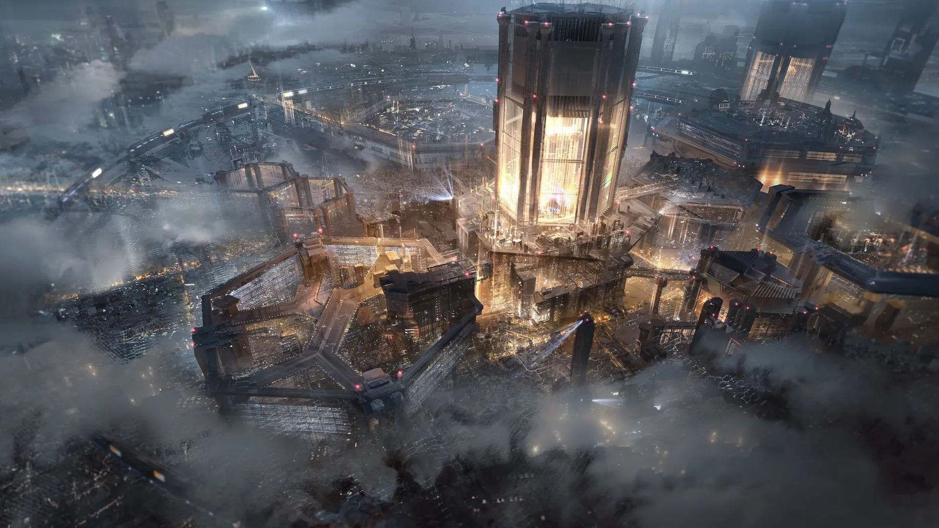 Architecture, Night, Mist, Lighting, Futuristic City, Pentagon, Computer Wallpaper, 4K Wallpaper