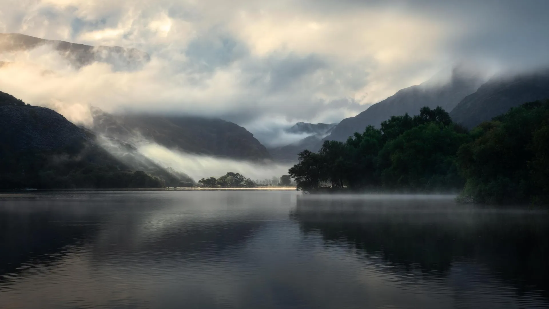Lake, scenery, Wales, nature, clouds, mist, sky, water