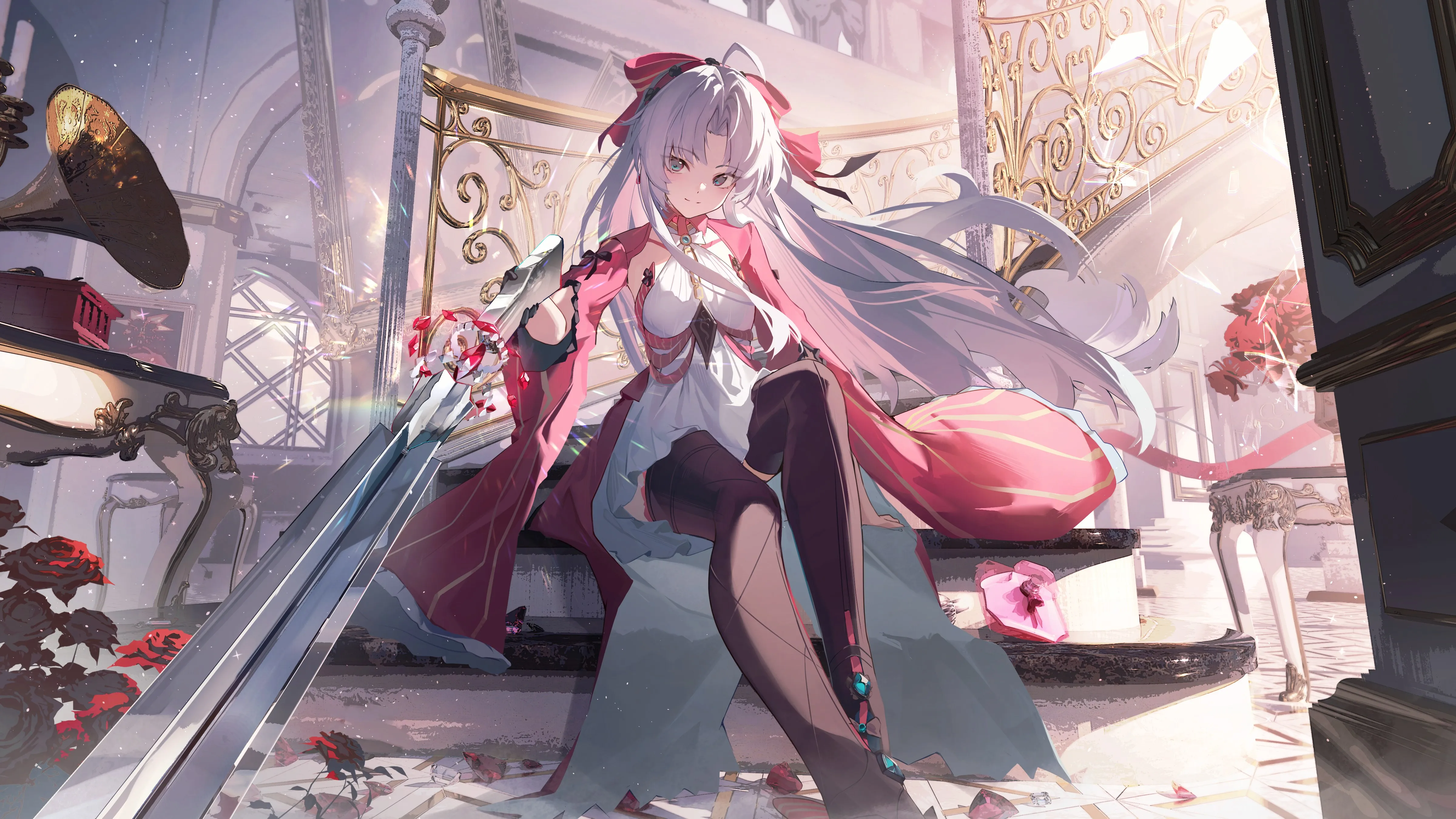 Sitting, holding a gun, girl, long hair, white hair, smiling, anime girl, howling wave, stairs, flowers, dress, weapon, rose, sunshine, thigh, high heels, black gloves, gloves, 4K wallpaper