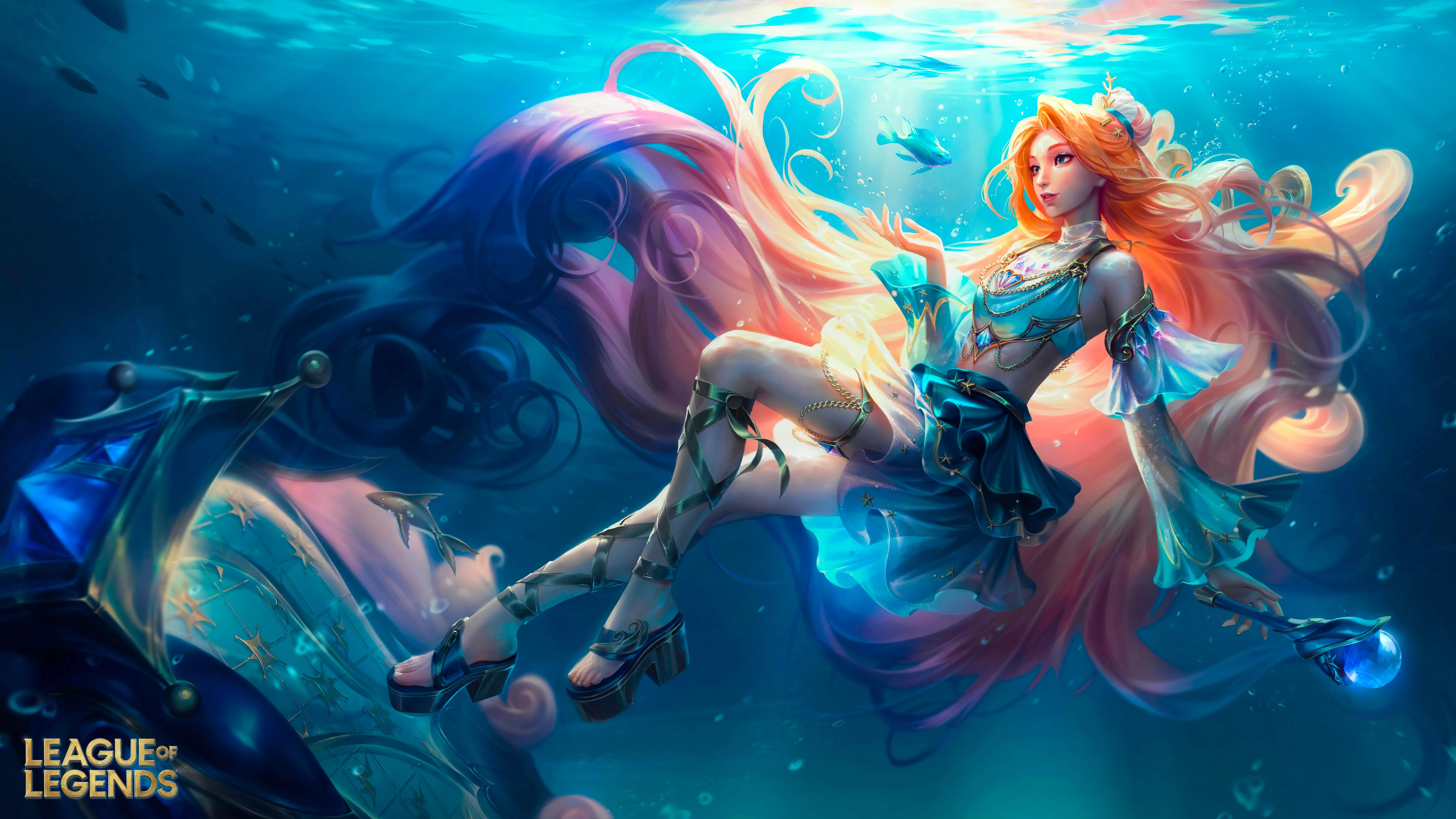 Leg, Fantasy, Girl, Game CG, Character, Long Hair, Red Hair, League of Legends, AI Art, Fantasy Art, Thick-sole Shoes, Skirt, Blue Clothing, Fish, Animal, Underwater, 8K Wallpaper