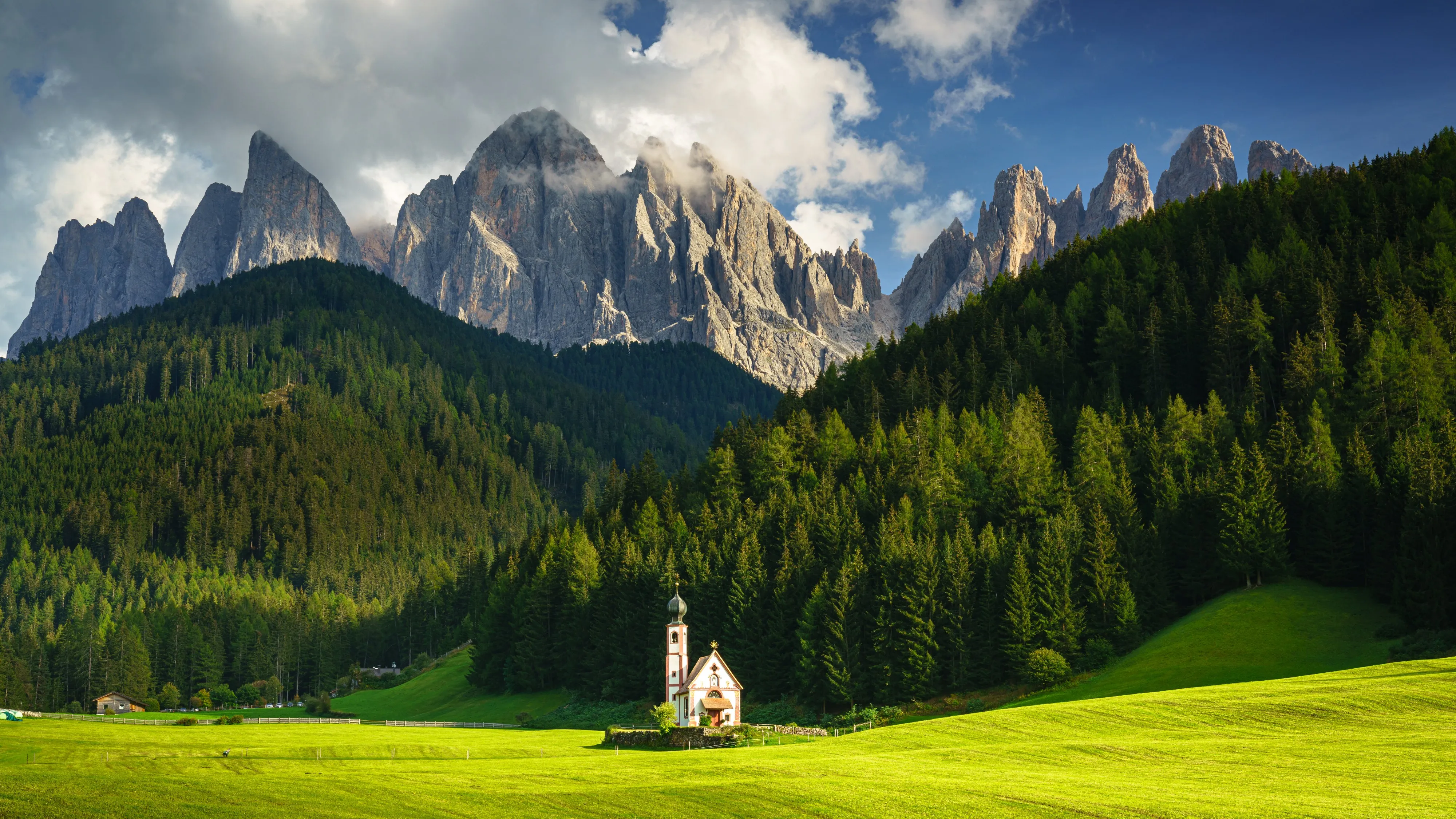 Natural Landscape Cathedral Grass Field Trees Pine Forest Cloud Sky Mountains 4K Wallpaper