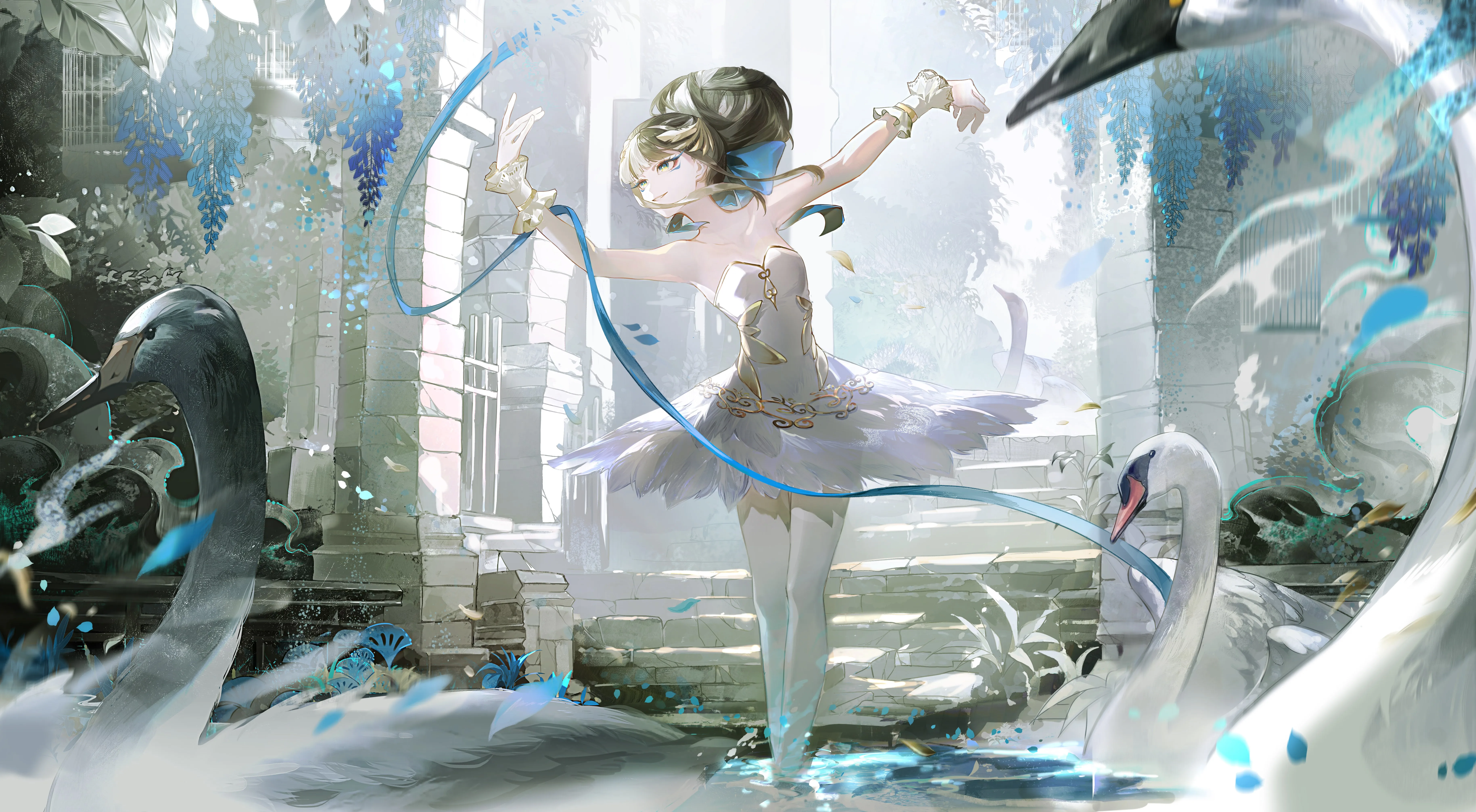 Shoulder-Baring, Outdoor, Woman, Blue Eyes, Water, Swan Lake, Swan, Black Hair, White Tights, Stairs, Petals, Leaves, Water Droplets, Dance, Animals, Blue Ribbon, Birdcage, 4K Wallpaper