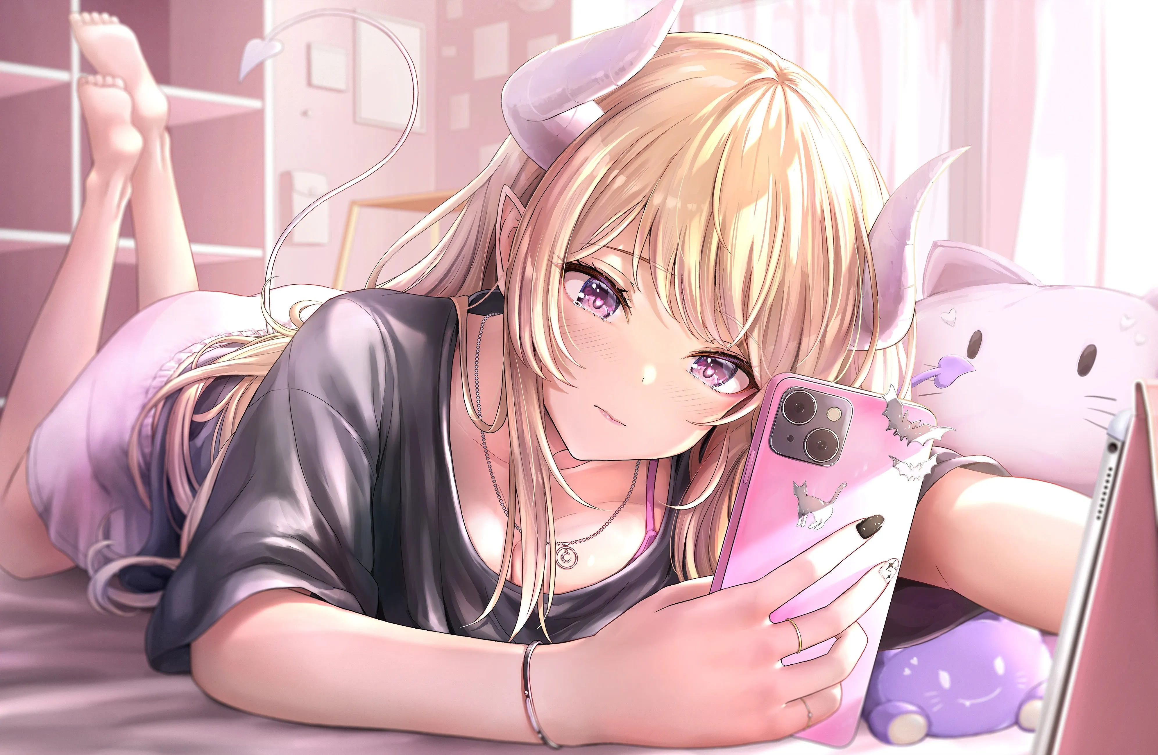 Female, Barefoot, Blonde, Long hair, Anime, Girl, Indoor, Animal ears, Horn, Smartphone, Purple eyes, Black nails, Necklace, Phone, 4K Wallpaper
