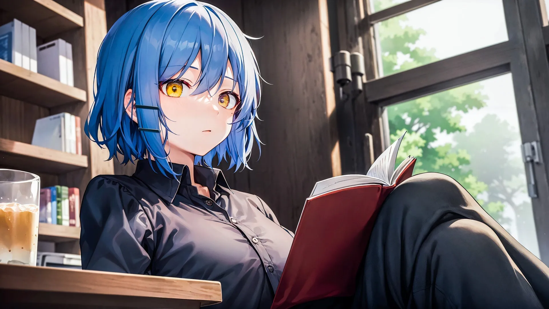 Yamada Ryoh, Anime, Girl Reading Book, Books, Drink, Window, Desktop Wallpaper, 4K Wallpaper