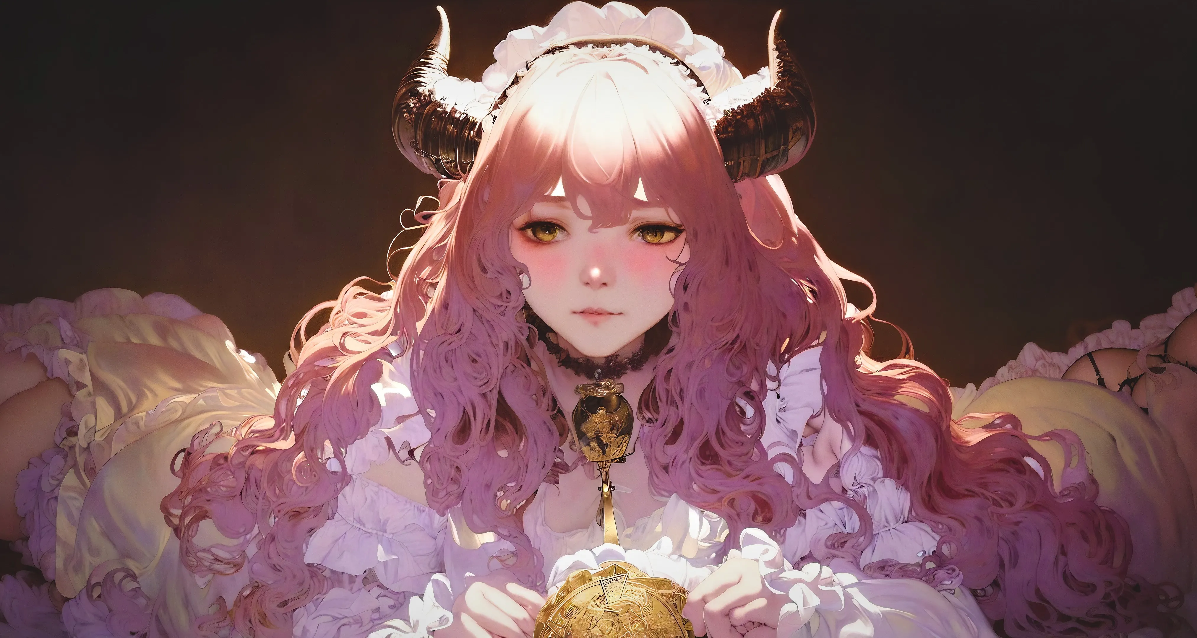 Woman, Long Hair, Pink Hair, Face, on Bed, Curly Hair, Corner, Anime, Girl, Artificial Intelligence Art, Stable Diffusion, 4K Wallpaper