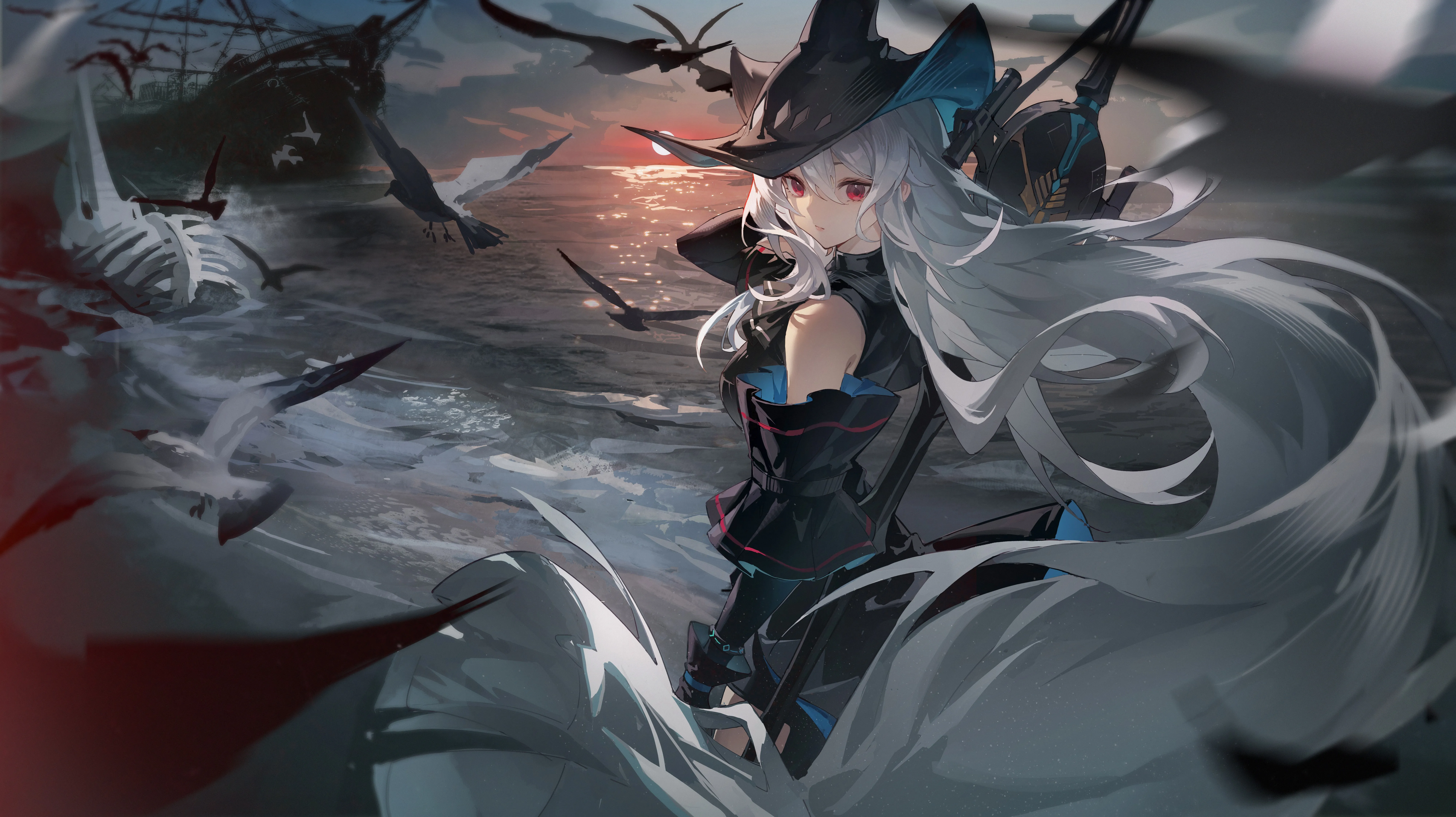 Path, Long hair, White hair, Red eyes, Hat, Looking back, Anime, Girl, Knight, Sunset, Dusk, Seagull, Water surface, Sky, Sea, Boat mooring, 8K wallpaper