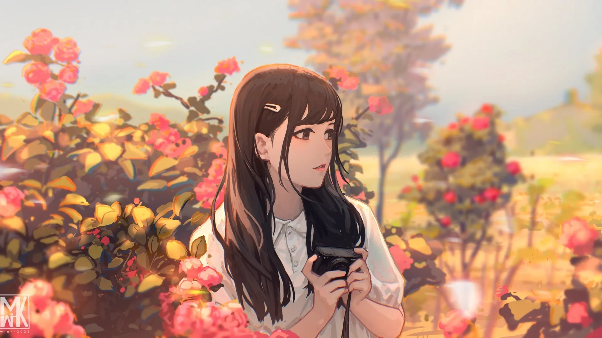 Long hair, Black eyes, Illustration, Flowers, Sunshine, Black hair, Computer wallpaper, 4K wallpaper