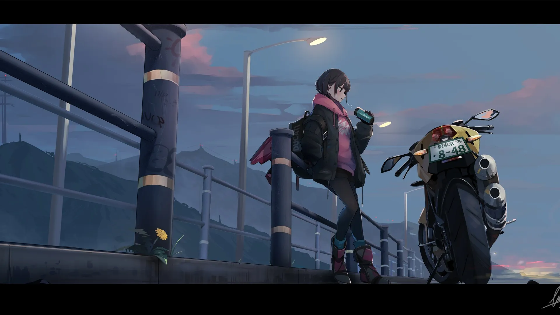 Anime, Motorcycle, Scarf, Jacket, Boots, Street Lamp, Cloud, Fence, Street Fighter