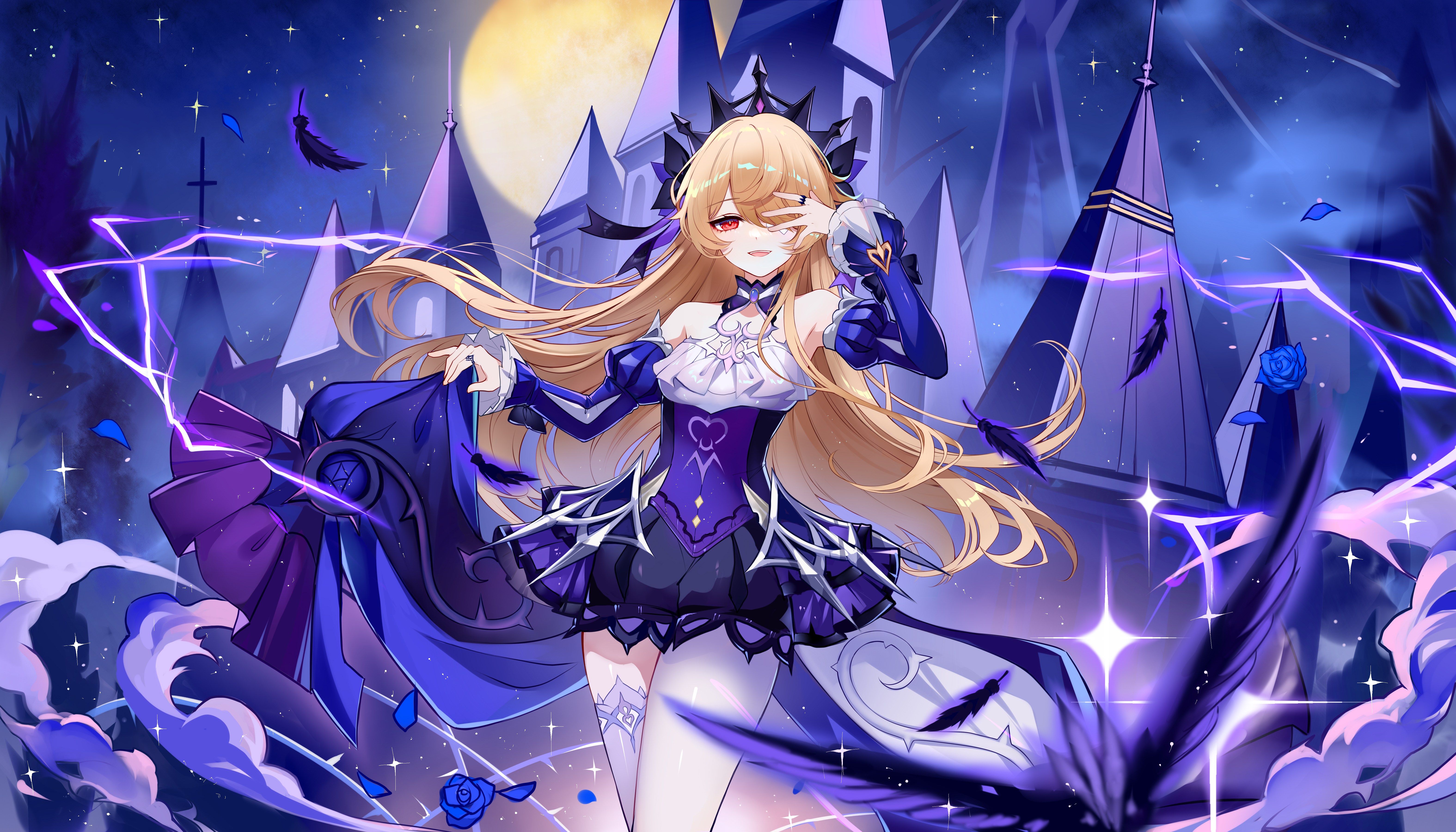 Red Eyes Anime Girl Genshin Fischl Petals Rose Feather Moon Castle Computer Wallpaper 4K Wallpaper
