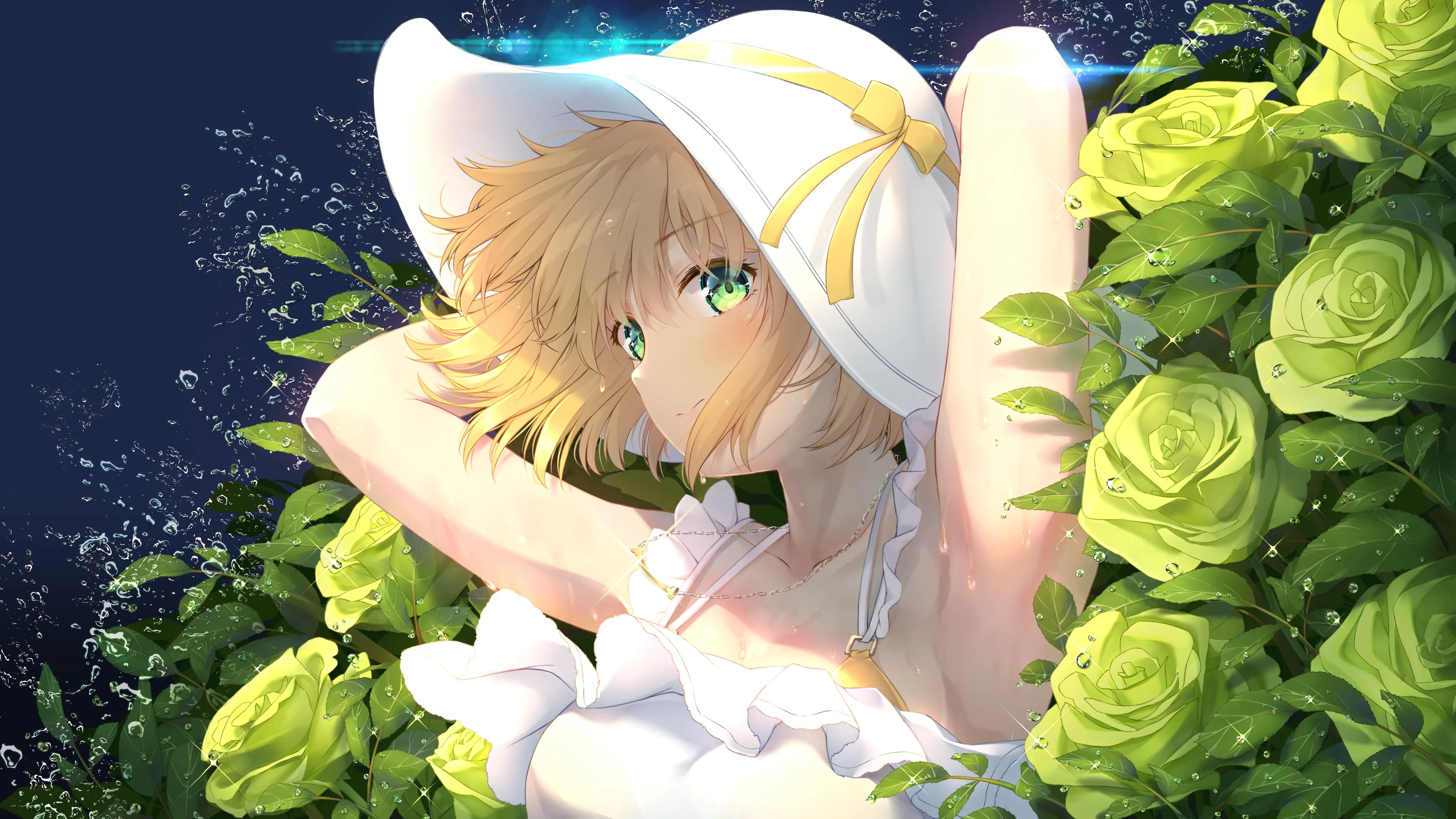 Golden hair, green eyes, anime, anime girl, AI art, portrait, hat, sundress, flowers, rose, computer wallpaper, 4K wallpaper