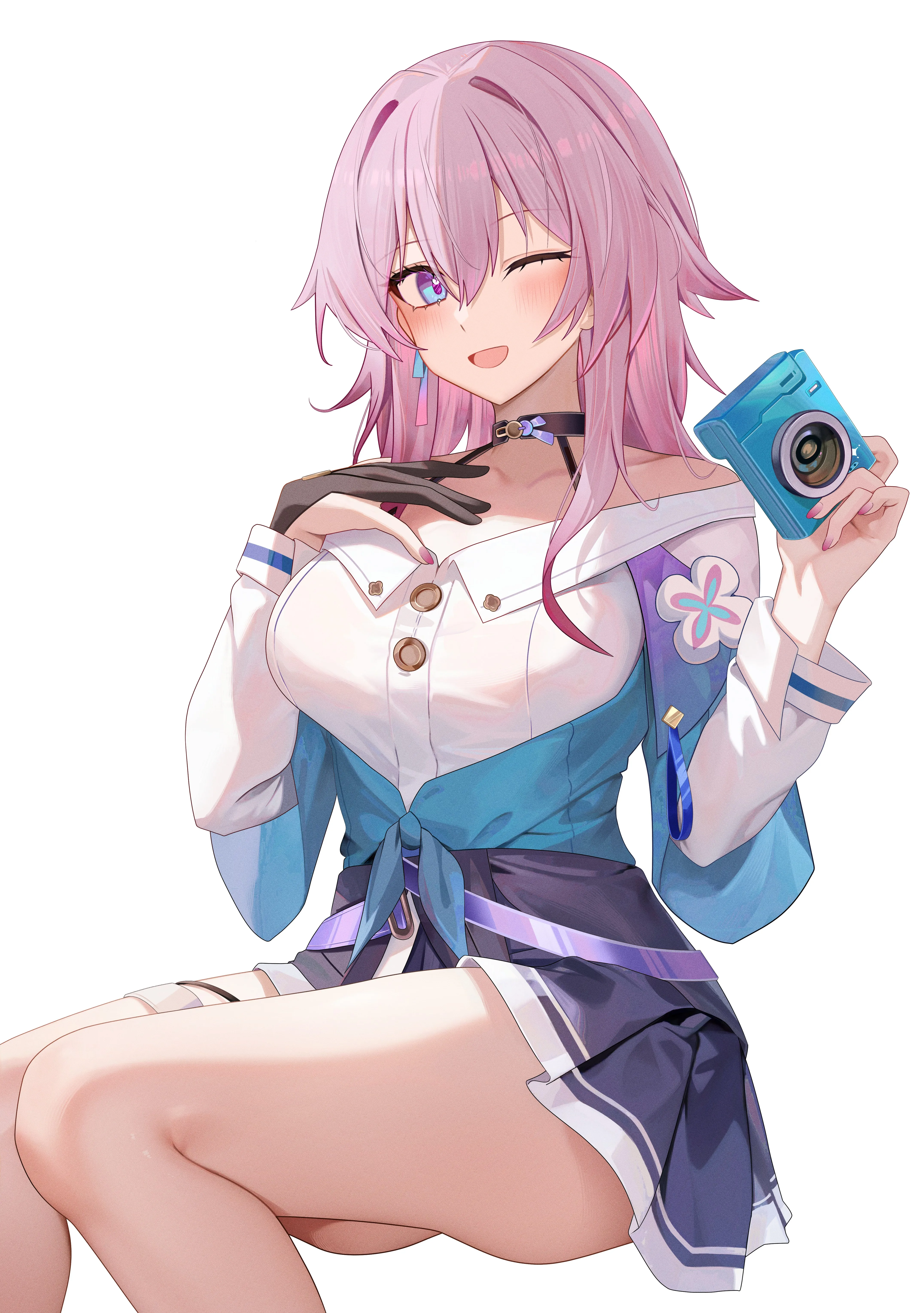 Sitting, Long Hair, Collapse, Interstellar Railway, Anime Girl, Blushing, Camera, Simple Background, White Background, Minimalism, Mobile Wallpaper, 4K Wallpaper