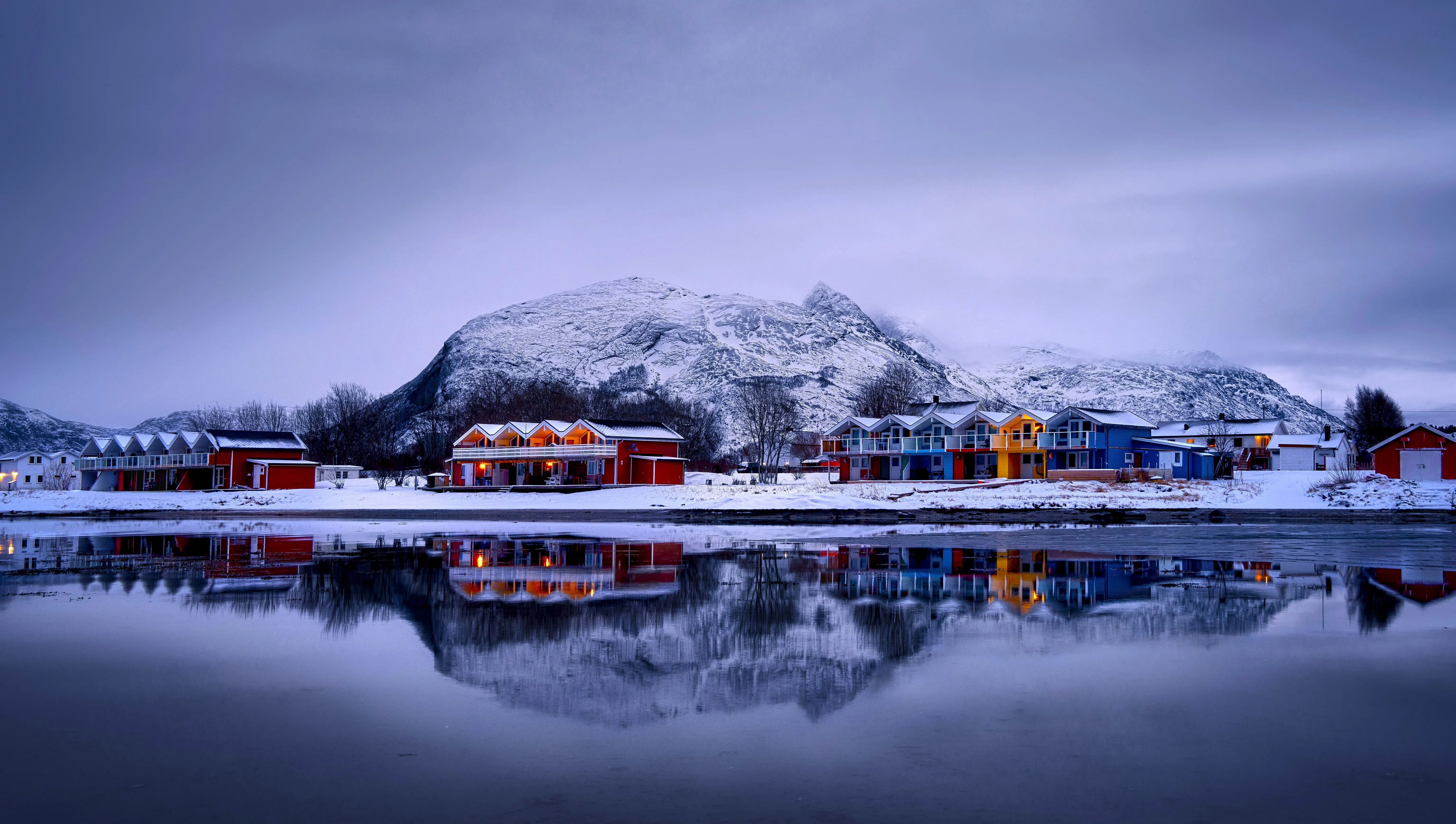 Nature, Landscape, Water, Trees, Clouds, Houses, Villages, Reflections, Snow, Winter, Sky, 4K Wallpaper