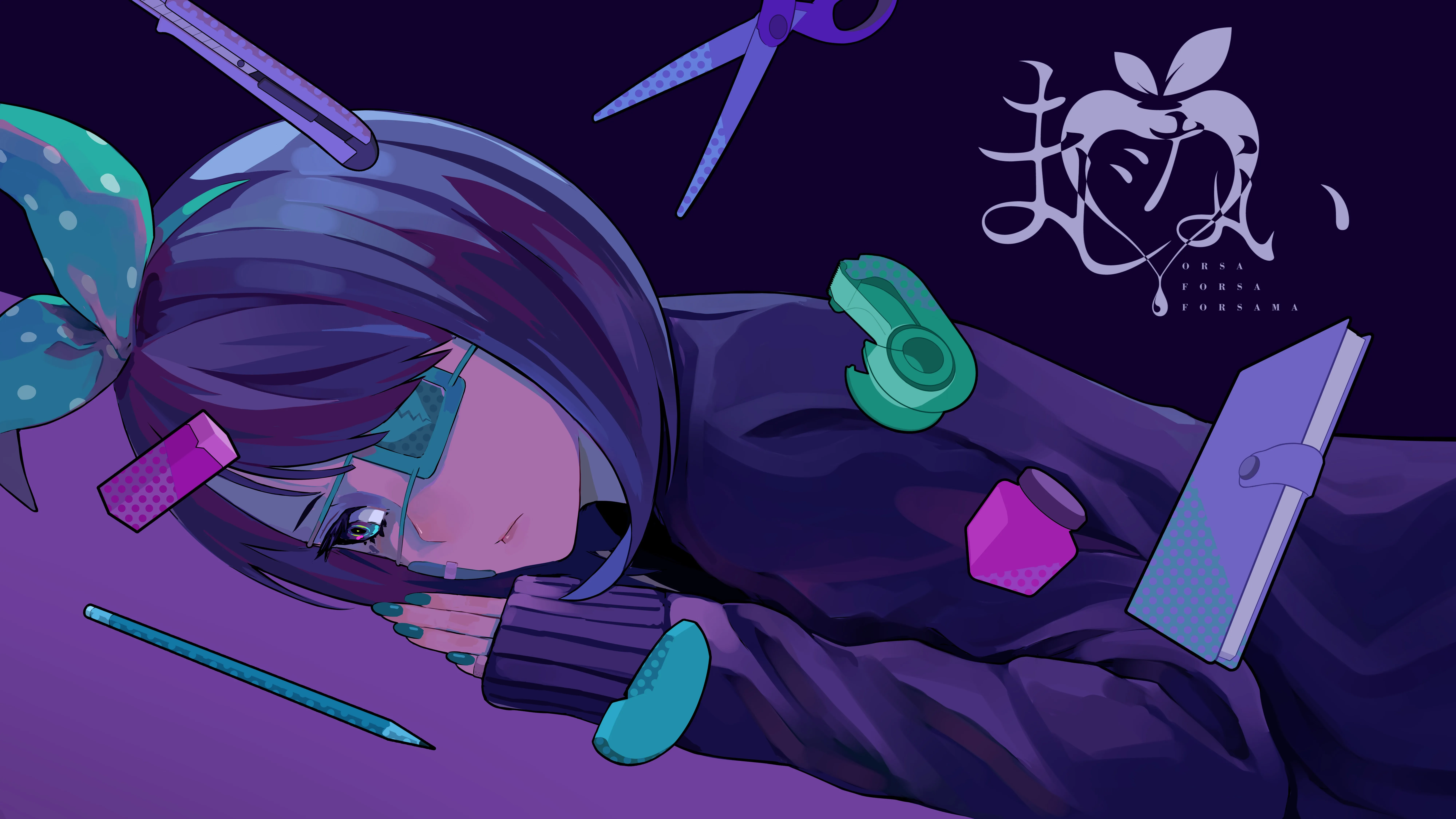 Nail, Face, Black Hair, Short Hair, Anime Girl, Headscarf, Pencil, Scissors, Book, Sweater, AI Art, Bandage, Anime, Eye Mask, Computer Wallpaper, 8K Wallpaper