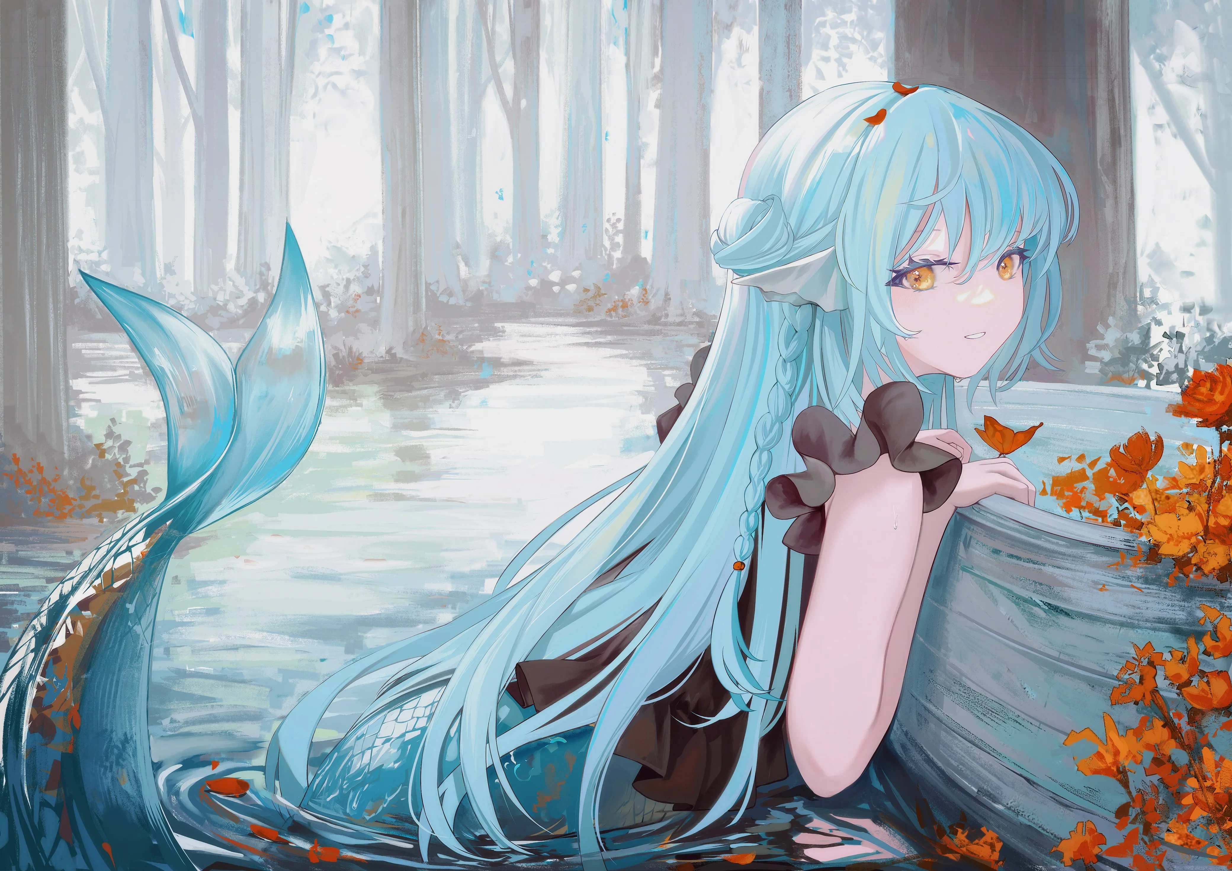 Long hair, Blue hair, Braid, Anime, Anime girl, Water, Tree, Butterfly, Yellow eyes, Mermaid - Computer wallpaper, 4K wallpaper
