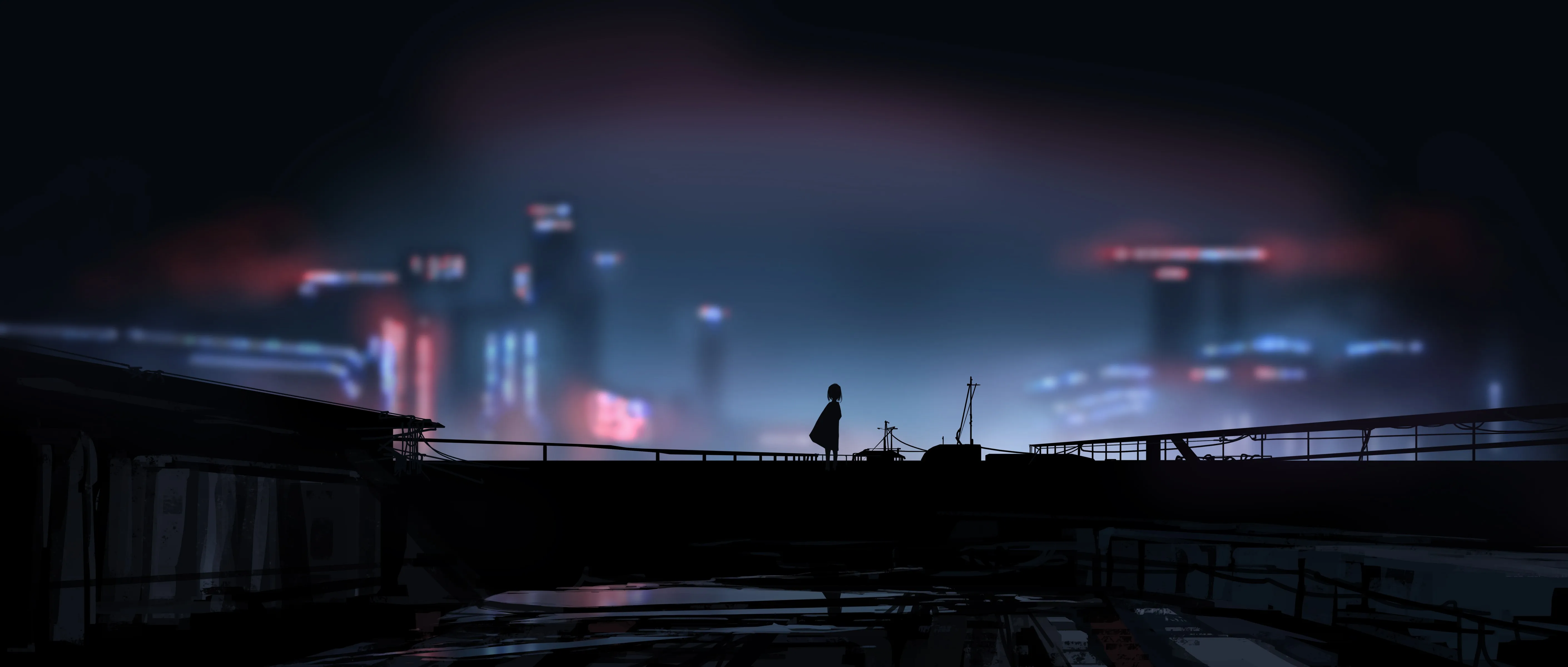 Illustration Wide Screen Extra Wide Silhouette Blurry Background City Landscape Roof 4K Wallpaper