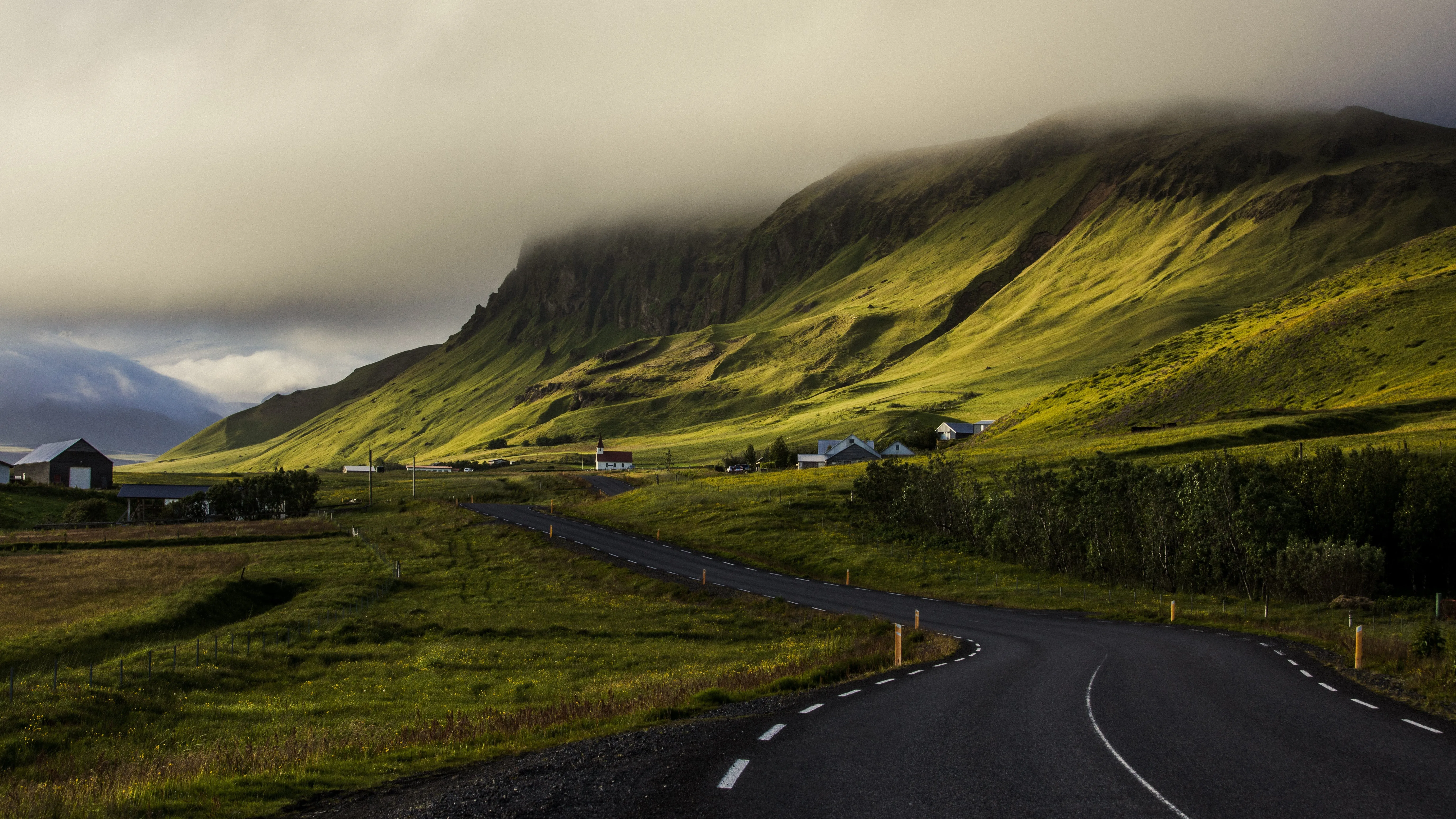 Nature, scenery, house, village, road, grassland, fence, fog, mountains, 4K wallpaper