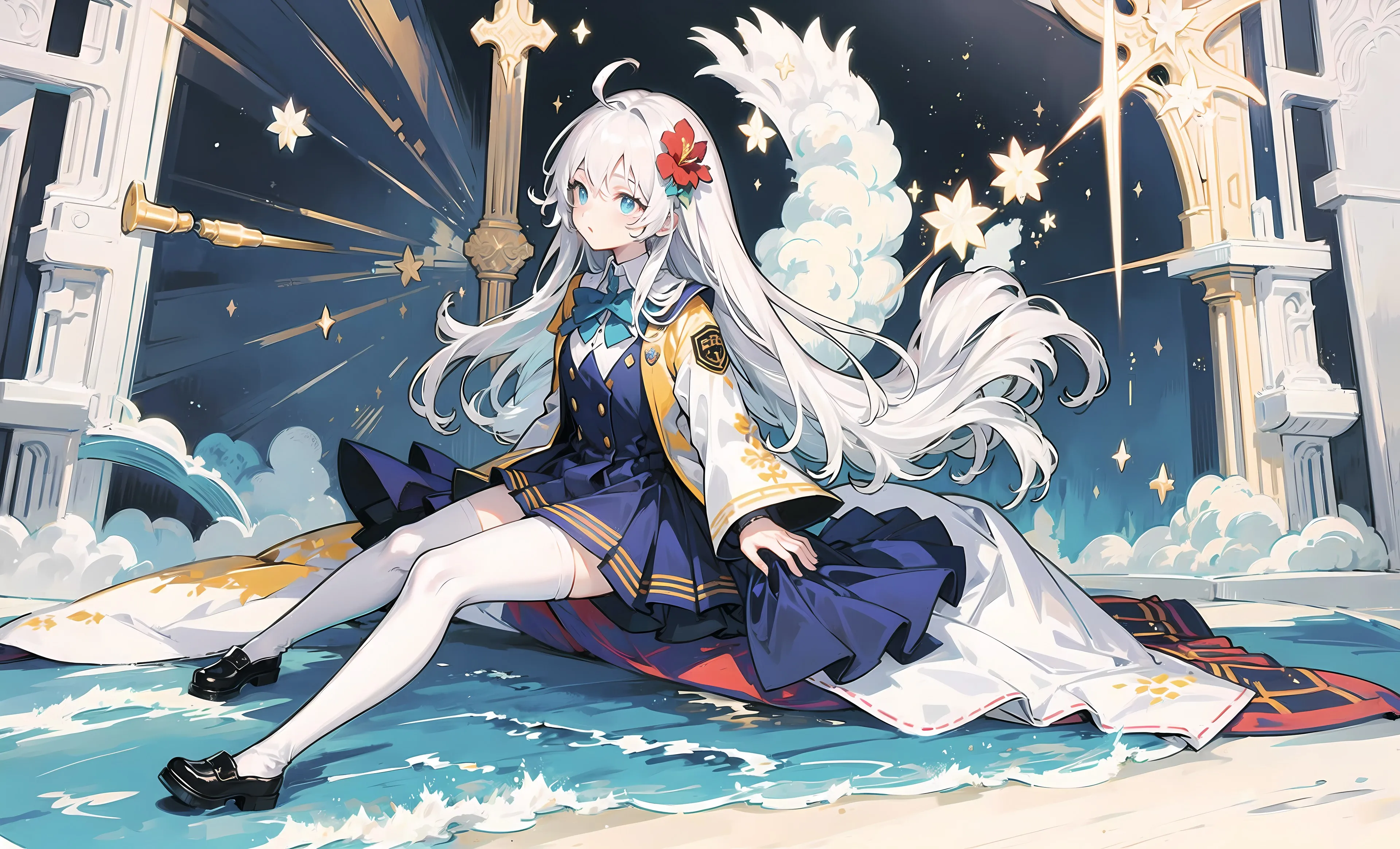 Female student, long hair, school uniform, dress, art, animation, girl, bow tie, flower in hair, tights, water, stars, skirt, 4K wallpaper