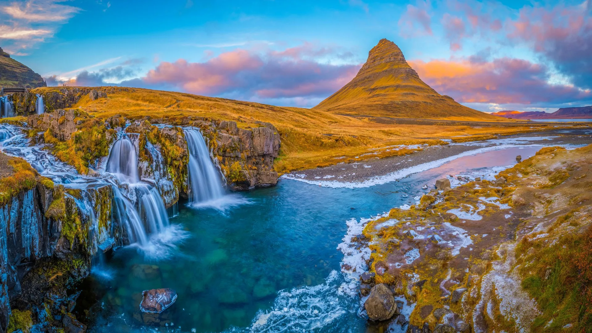 Iceland, nature, landscape, waterfall, river, mountain, water, sunset, sky, cloud, stone, Kj枚lur, computer wallpaper, 4K wallpaper