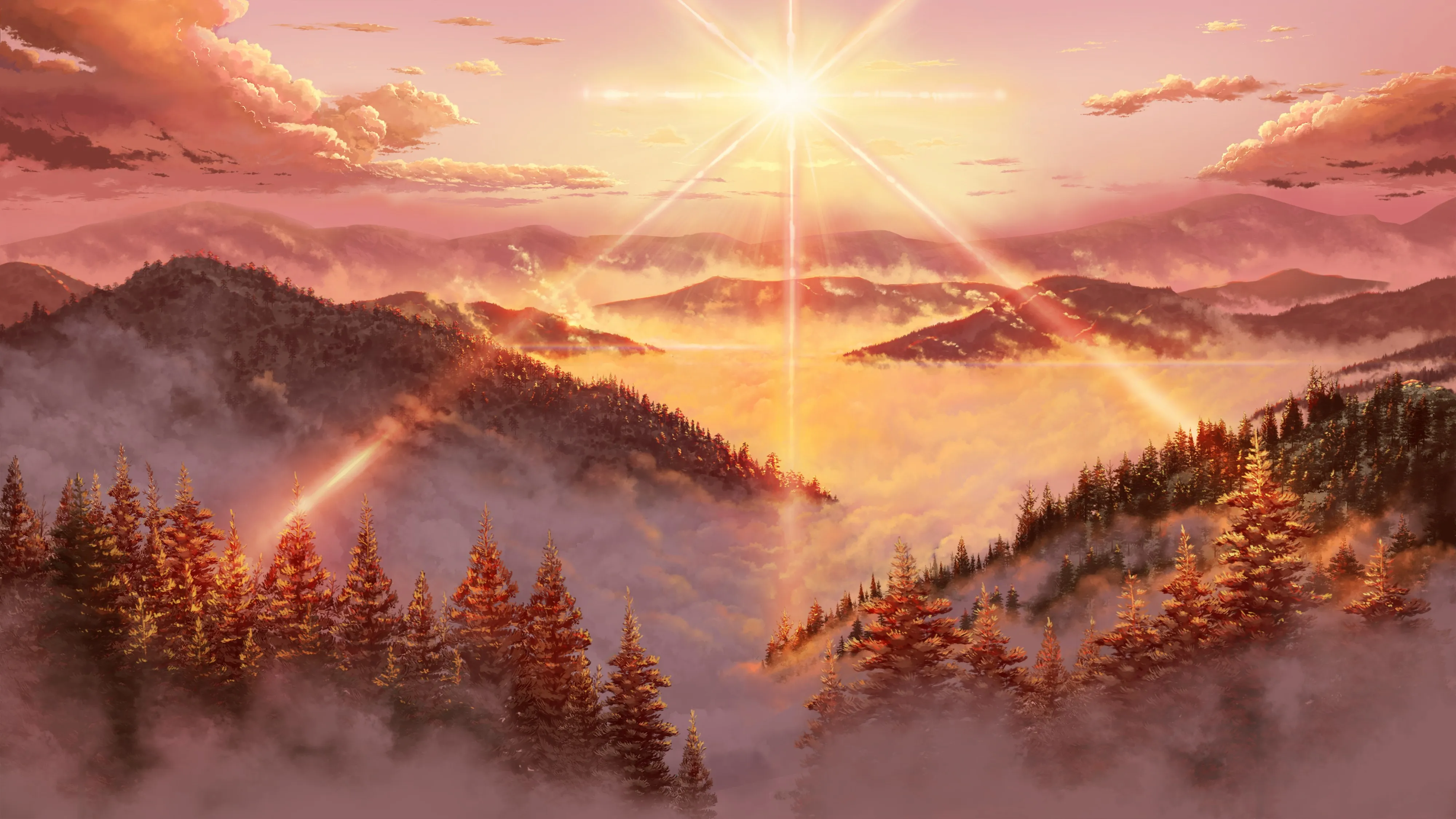 AI Art Illustration Landscape Mountains Forest Trees Sun Sky Cloud Sunshine Nature Sunset Glow Sunshine 4K Wallpaper