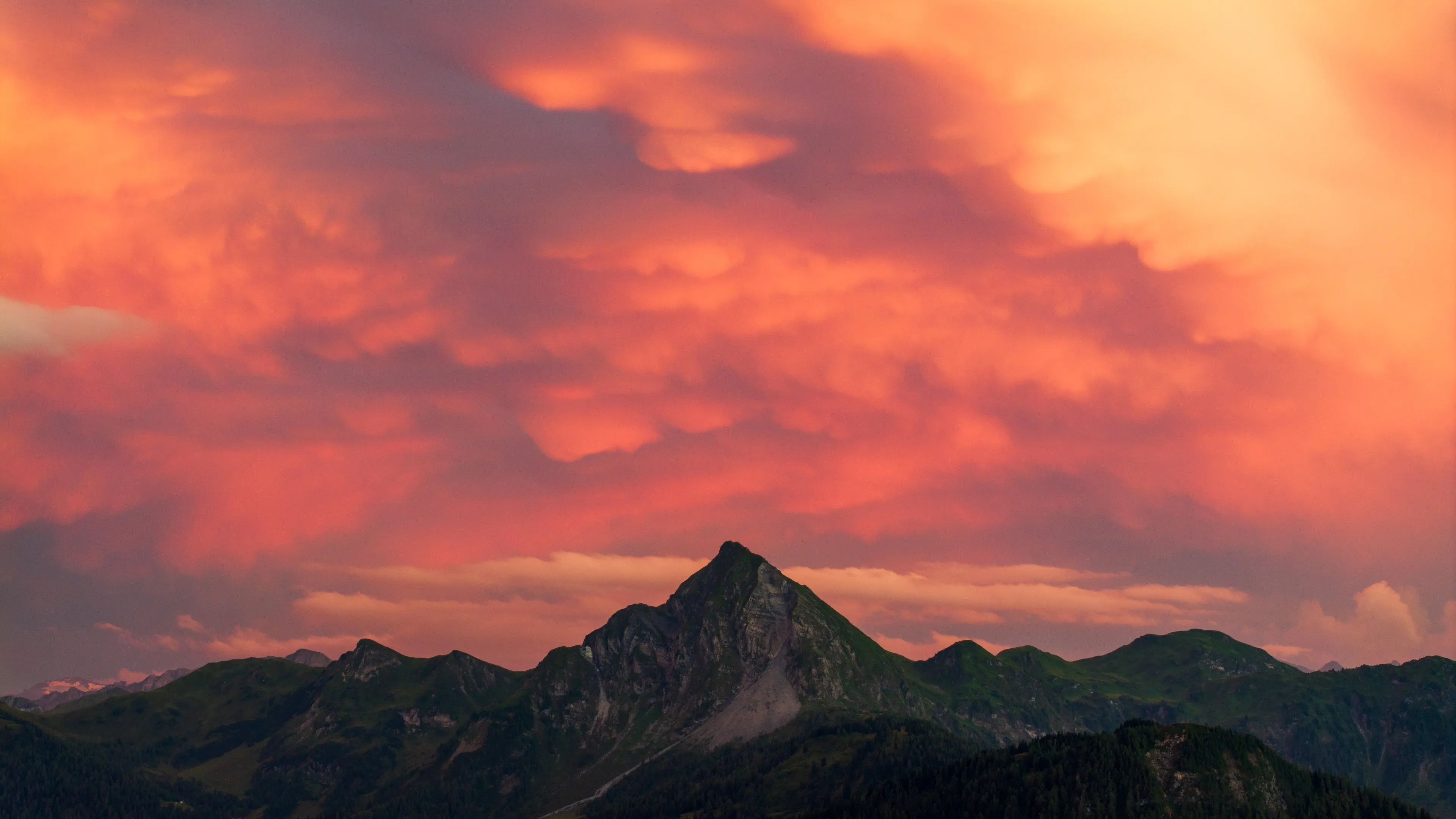 Nature, scenery, mountains, sky, clouds, pink clouds, trees, drone, photo, 4K wallpaper