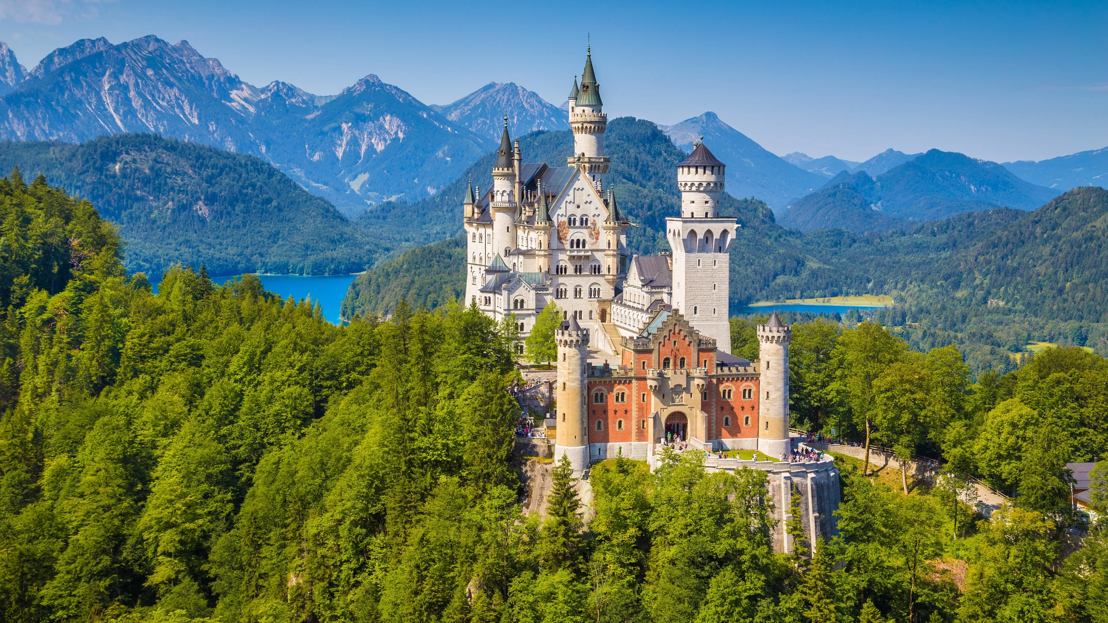 Swan Castle, scenery, forest, mountains, castle, sky, architecture, 4K wallpaper