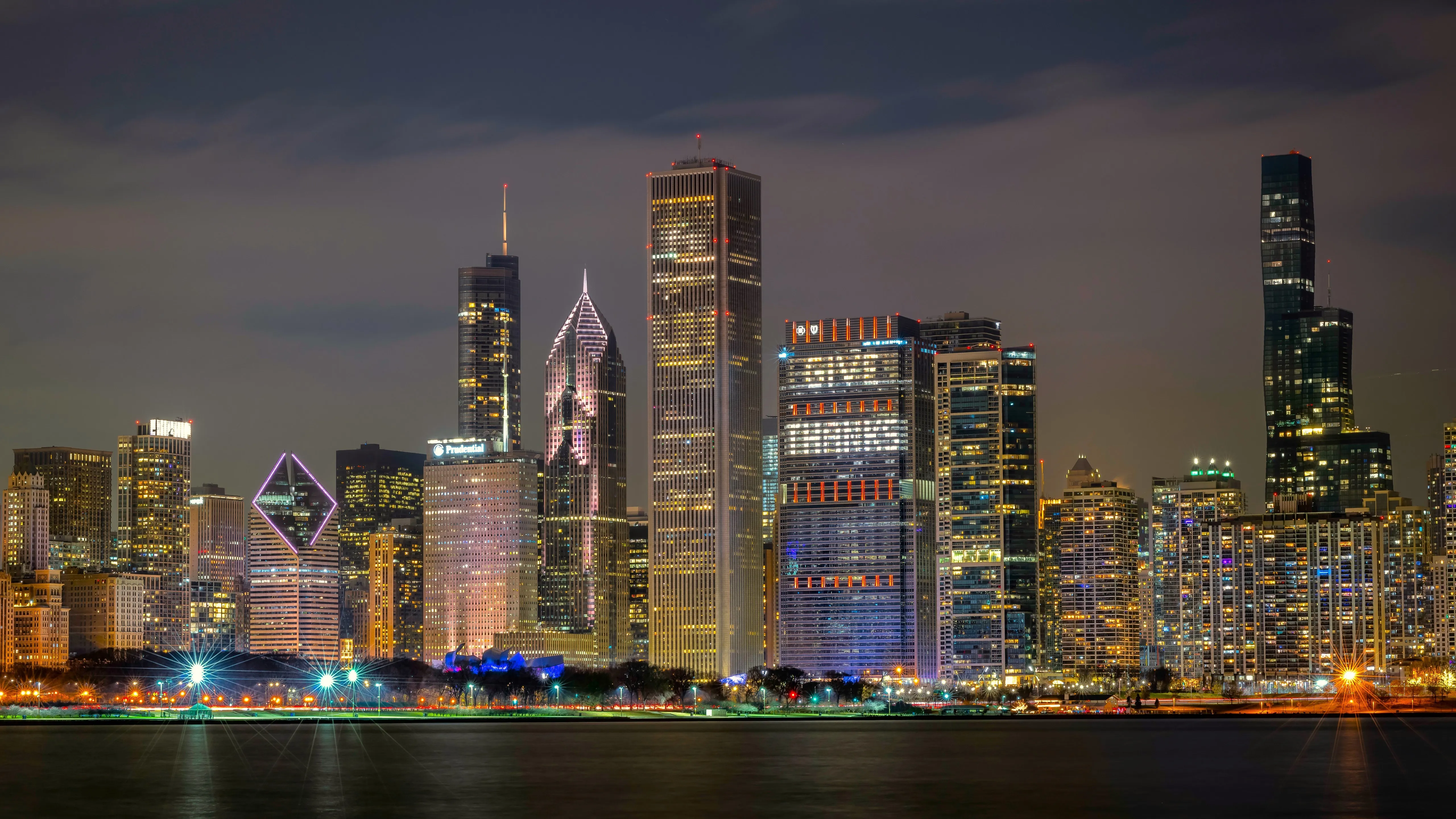 Landscape, City, Architecture, Trees, Lights, Night, Skyscrapers, Apartment, Horizon, Sky, Water, River, 4K Wallpaper