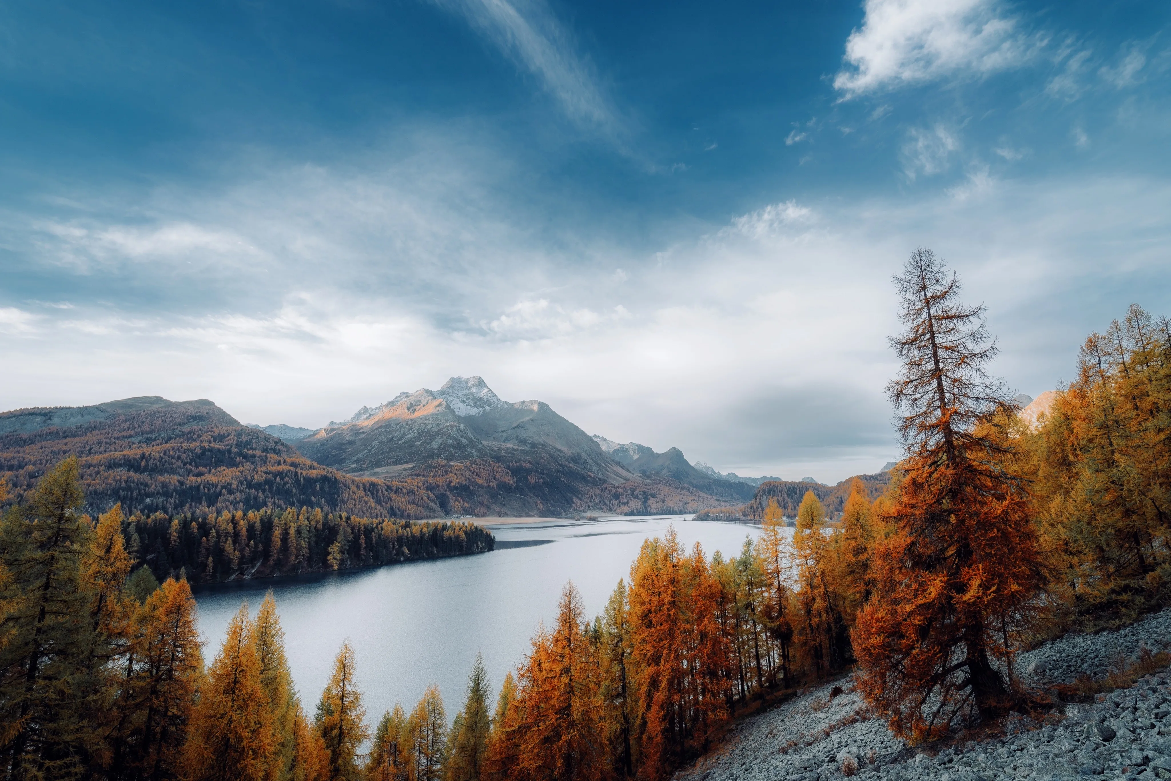 Scenery, nature, mountain, lake, pine tree, autumn, cloud, sky, tree, frost, 4K wallpaper