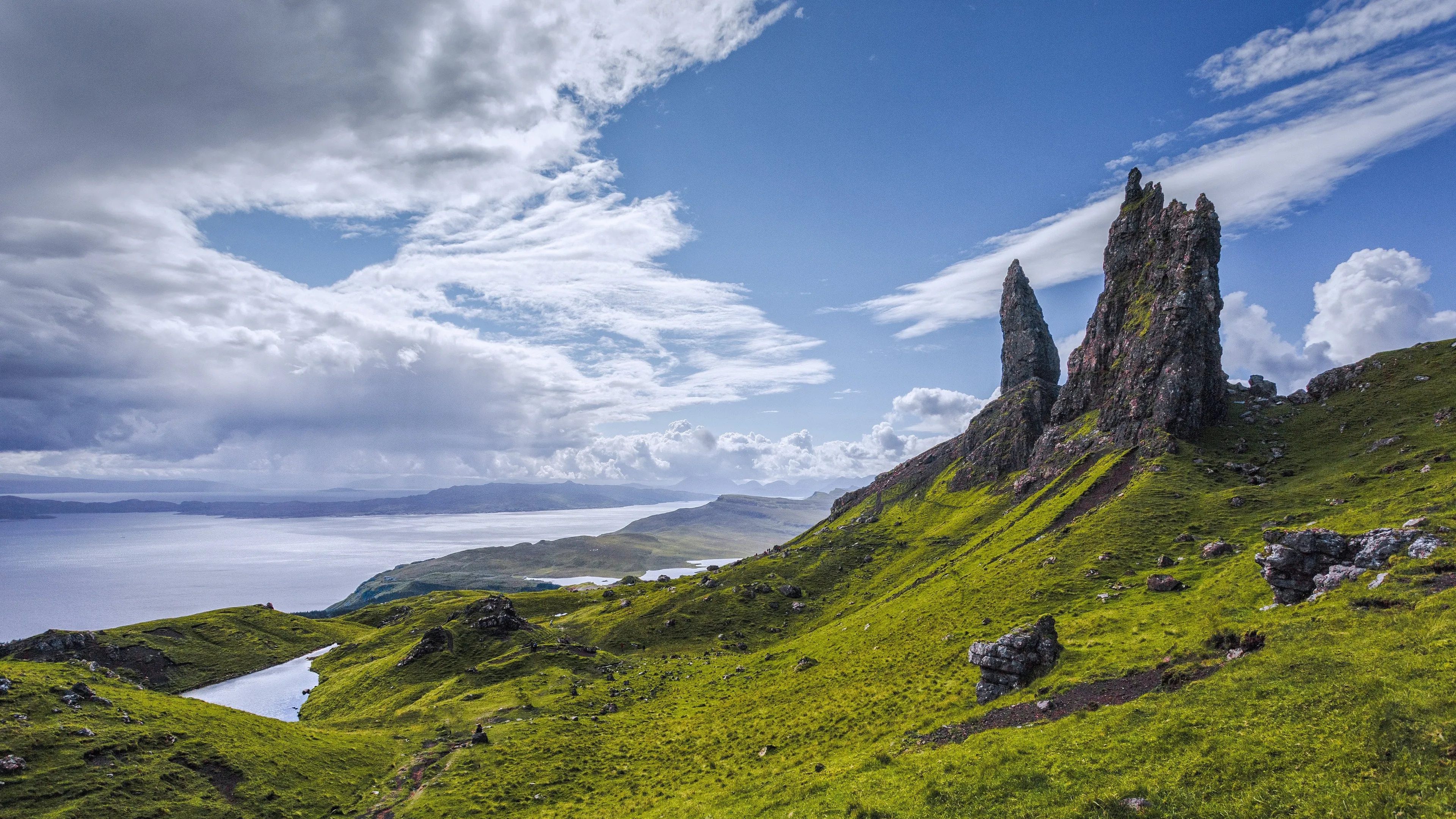 Nature, Scenery, Skye, Rock Layers, Fields, Ocean, Coast, Sky, Clouds, Stones, 4K Wallpaper