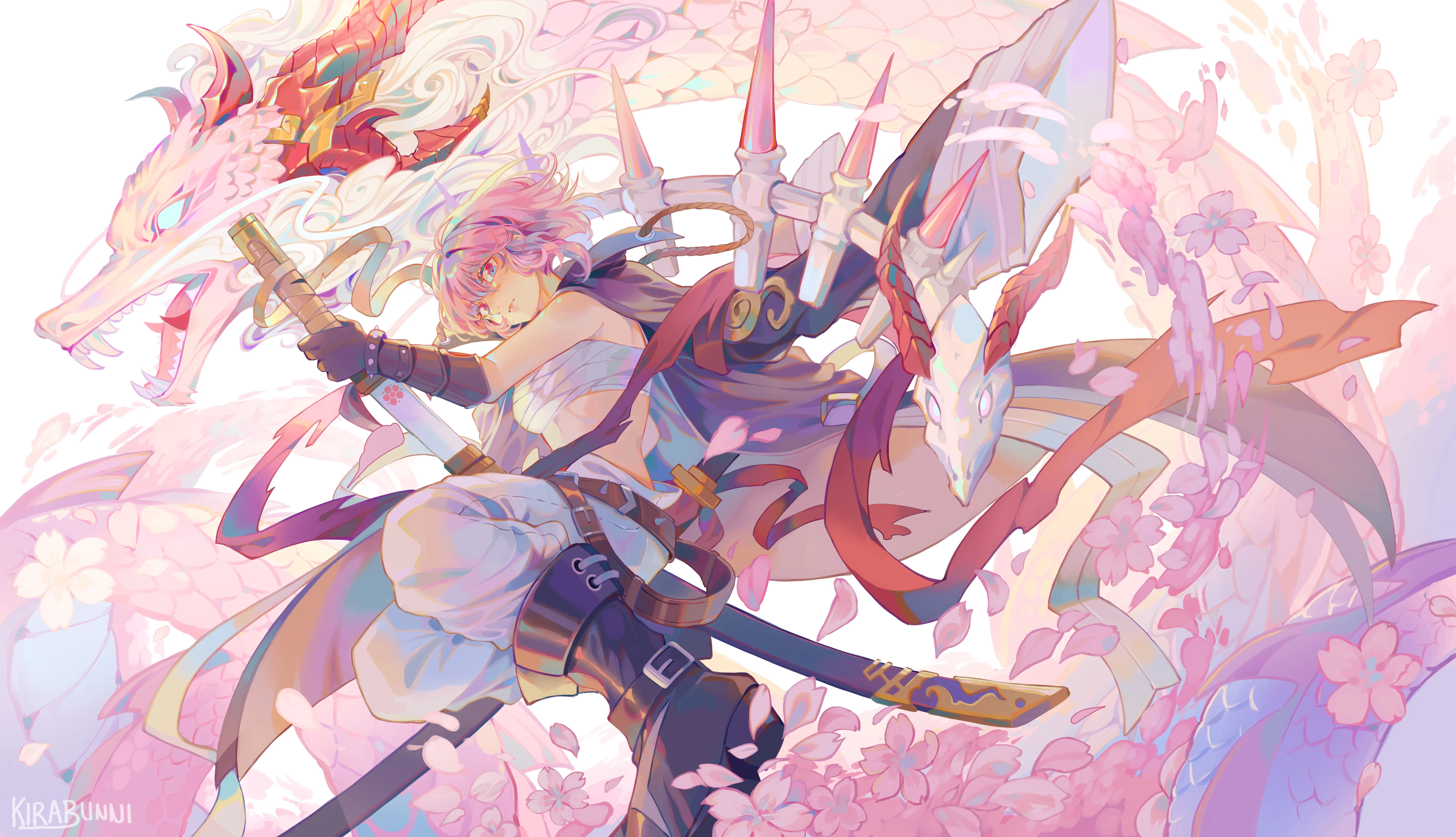 Anime Girl, Alchemy, Game CG, Dragon, Samurai, Weapon, Petals, Chinese Dragon, 4K Wallpaper