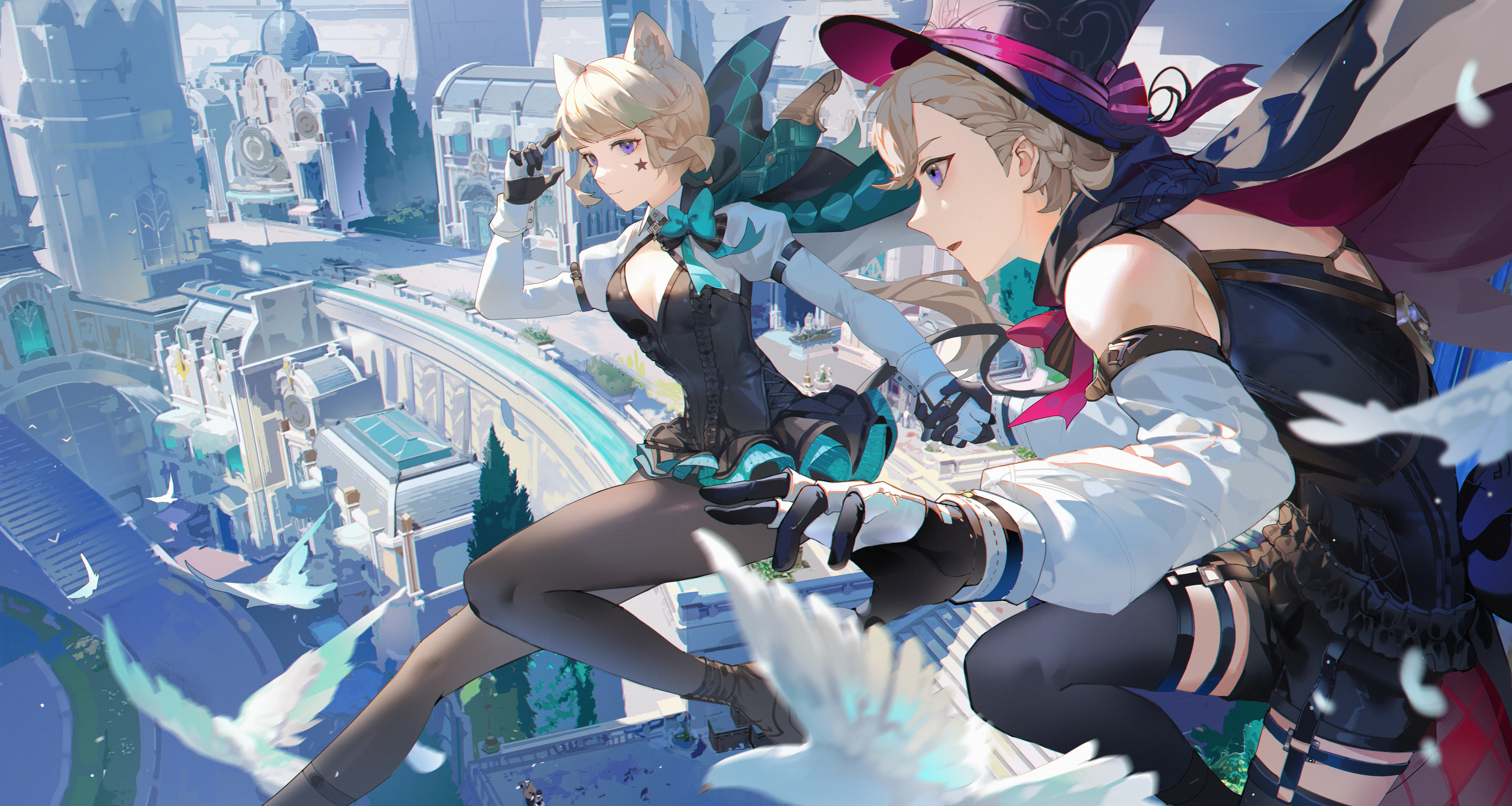 Genshin Impact, Cat Girl, Holding Hands, Braid, Anime Boy, Anime Girl, Bird, Animal, Hat, Cat Ears, Architecture, Feather, 8K Wallpaper