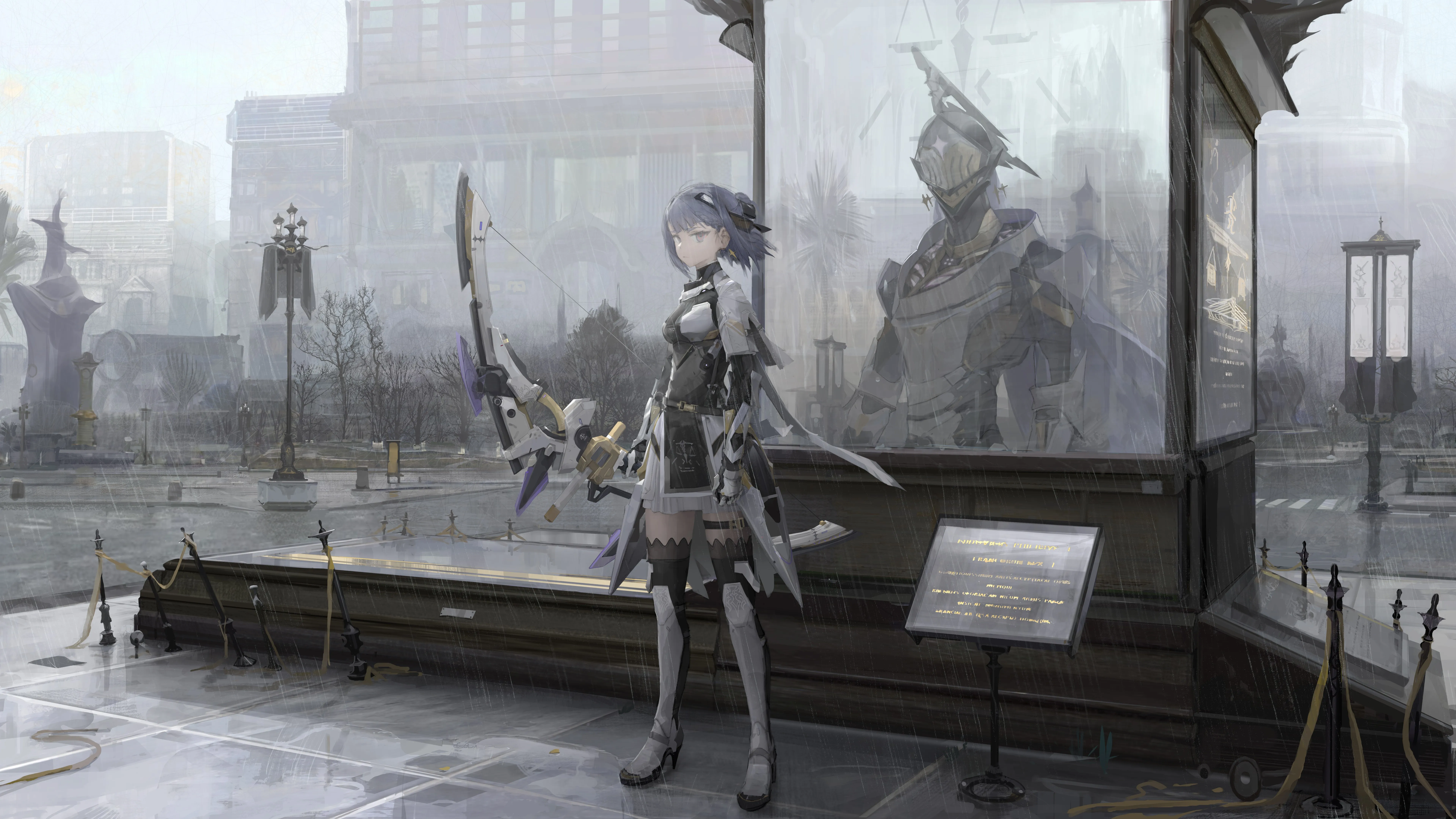 Standing, Short Hair, Armor, Bow Tie Girl, Punishment, Grey Raven, Elisa, Rain, Architecture, City, Anime Girl, 8K Wallpaper