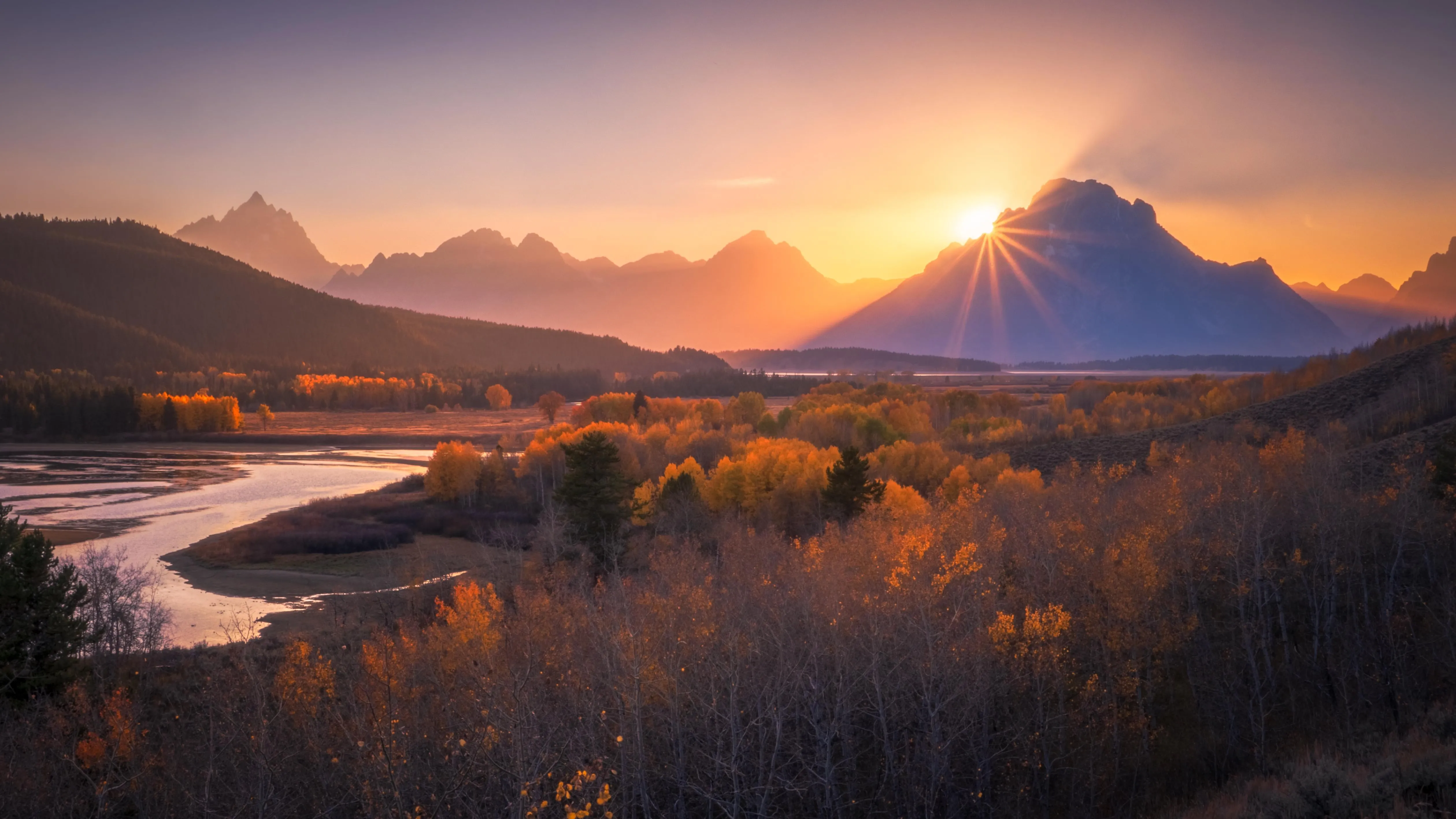 Sunset, mountains, forest, scenery, nature, autumn, river, sunshine, 4K wallpaper