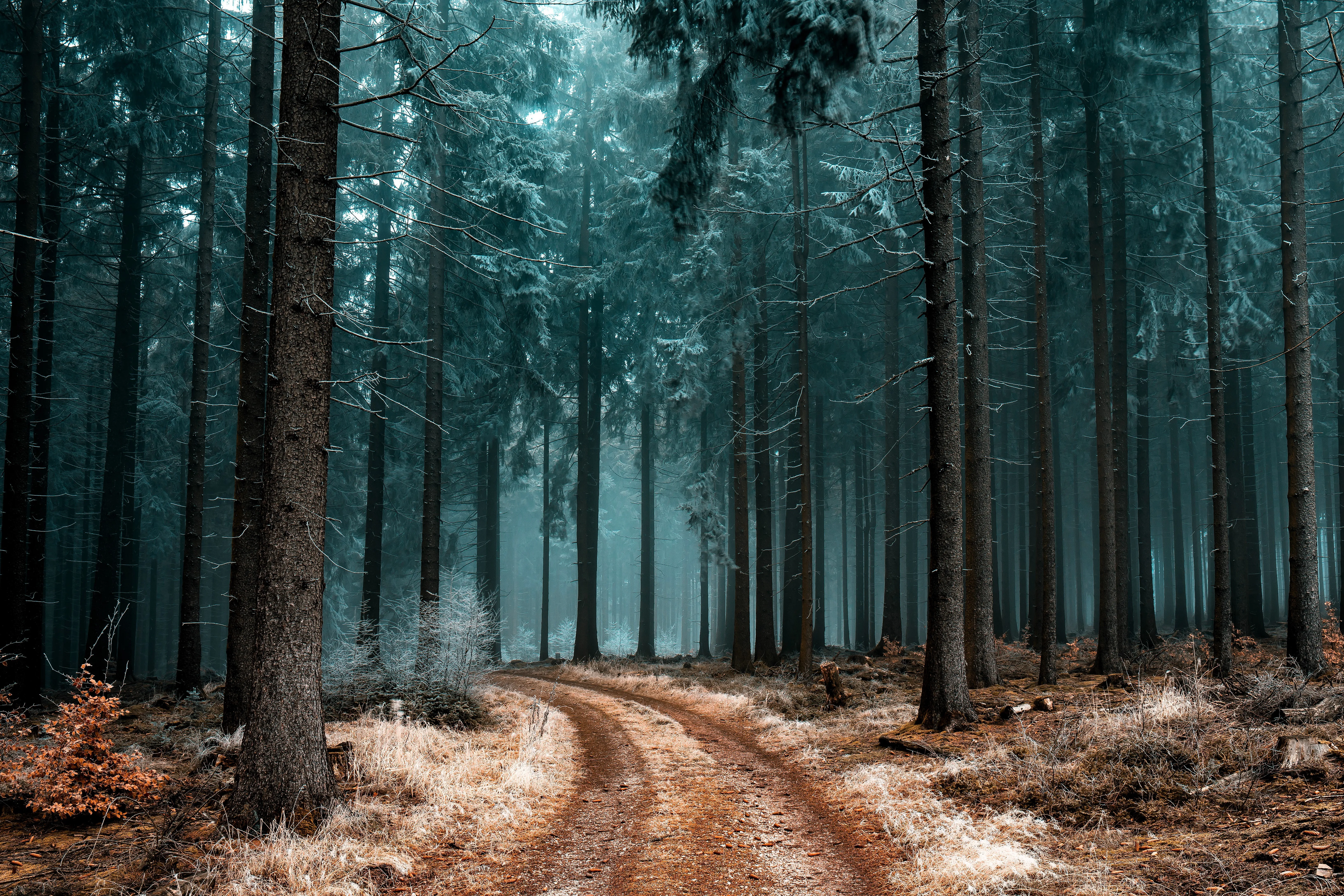 Frost, Cold, Scenery, Nature, Road, Trees, Forest, Mist Brown, Green, 4K Wallpaper