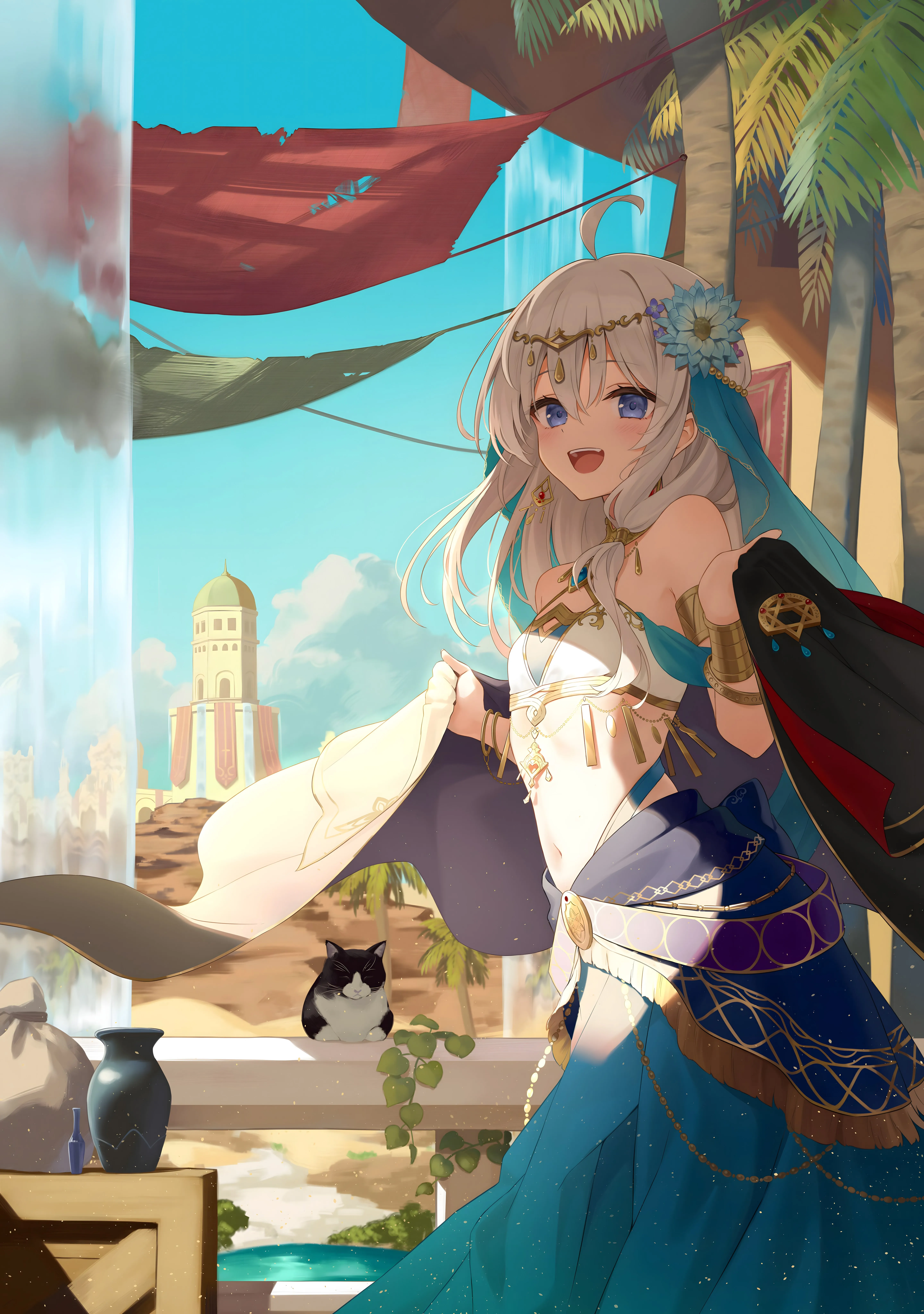 White hair, blue eyes, gray hair, anime, girl, earrings, clouds, sky, cat, waterfall, water, vase, sunlight, palm trees, mobile wallpaper, 4K wallpaper